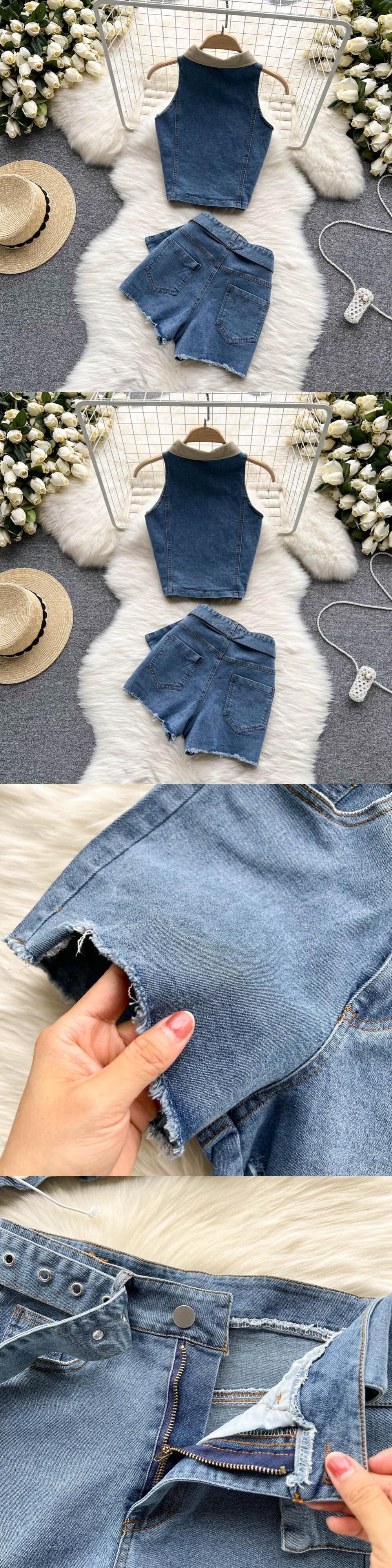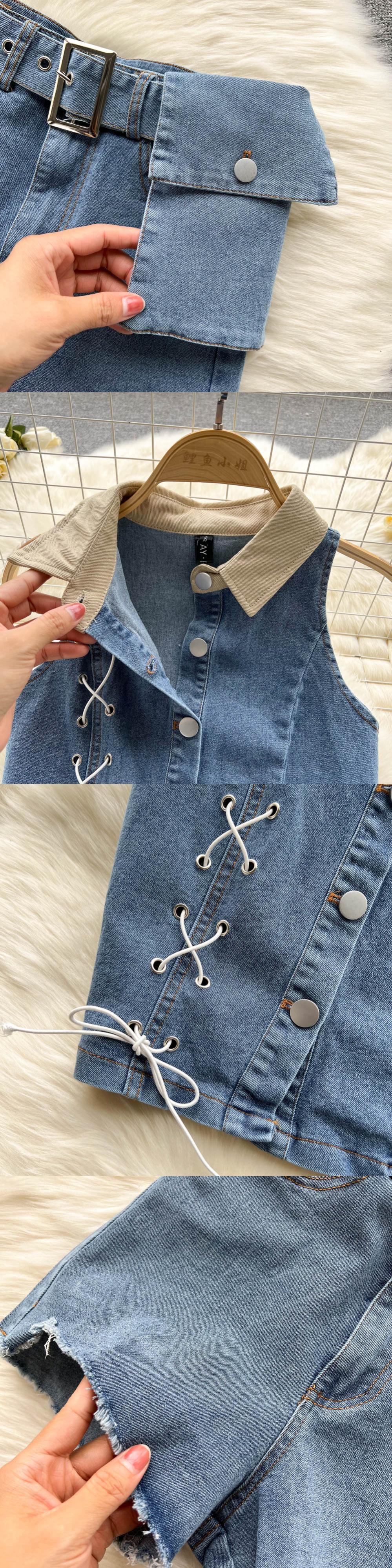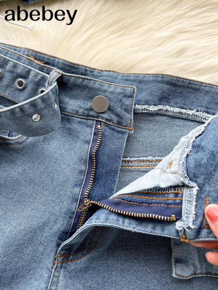 2022ストラップホルタースリムデニムクロップトップベルトウエストワイドレッグショートジーンズブルーツーピースセット ハーネス ワイドパンツ Abe22763300097