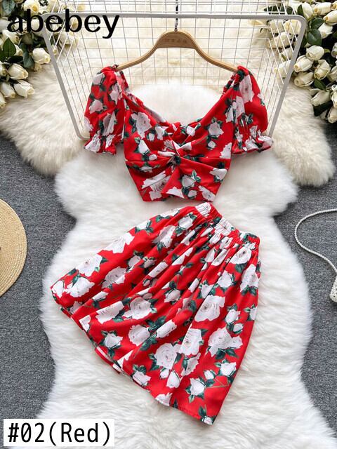 サマーホリデーフローラルプリントVネッククロップトップシャー+ウエストレディースショートスカートセット2022 夏物 花柄 Abe14937000506