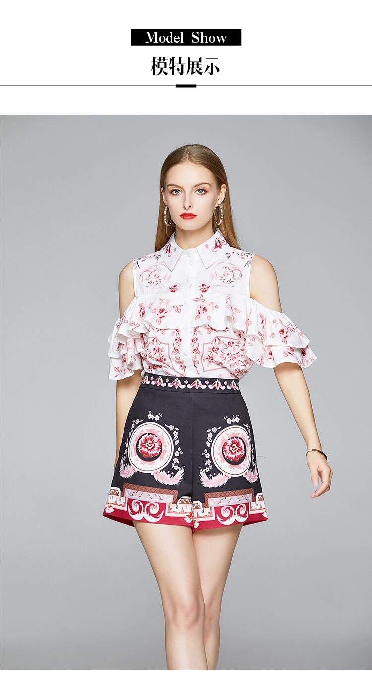 ランウェイサマー2ピースセットレディースオフショルダーフリルフローラルプリントシャツトップス+ウエストワイドレッグショーツセット ラッフル 夏物 ブルマー 花柄 ワイドパンツ Rhc21474397982
