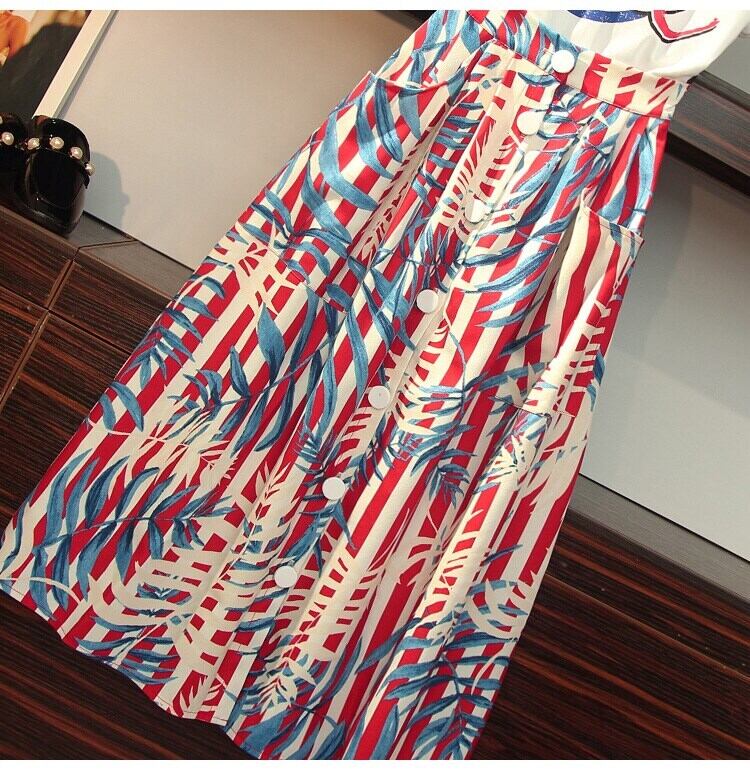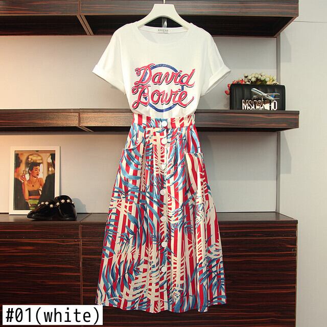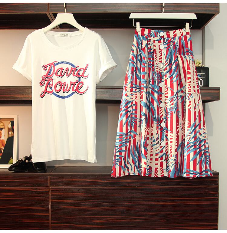 2020サマーレタープリント半袖Tシャツトップス+シングルブレストストライププリントミッドスカートセットレディース2点セット ショート ハーフスリーブ 夏物 Rhc33896227262