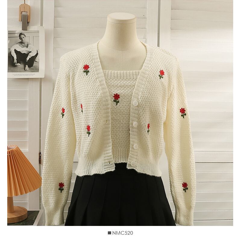 2022年秋ツーピーストップスーツフラワー刺繍ニットカーディガンとスリングセータースタイルスリムスウィートジャケットセット レッド 大人ガーリー キュート カジュアル オータム 秋物 フラワーデザイン Abe9500293865
