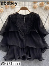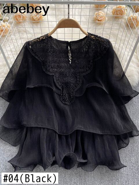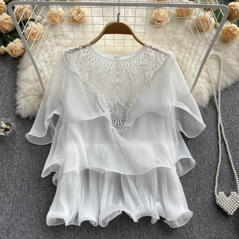 サマーレースセクシーブラウスoネック半袖トップス多層フリルスウィートブラウス ショート ハーフスリーブ 大人ガーリー キュート カジュアル 夏物 マルチレイヤー Abe90665811138
