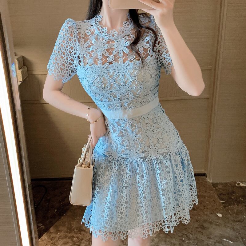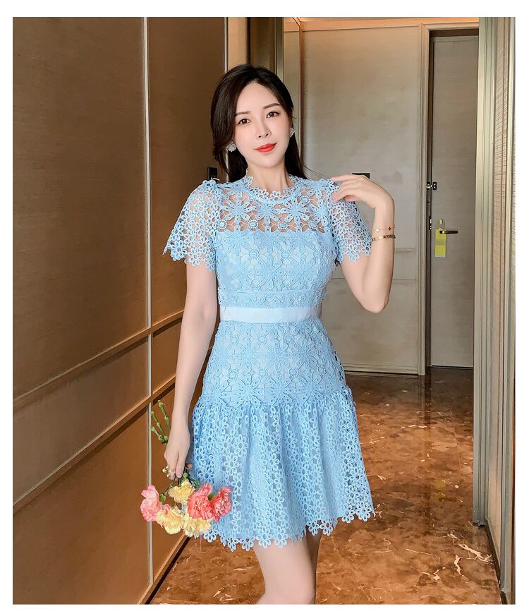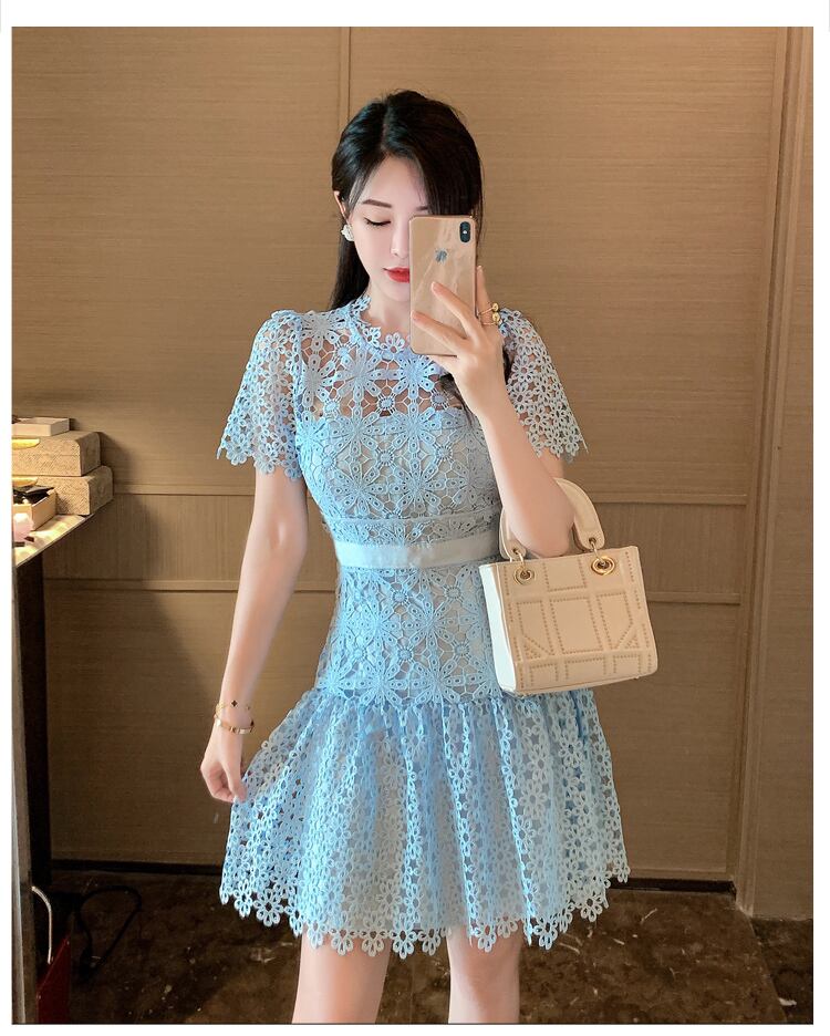 HIghWomen半袖シースルーランウェイドレス2022サマーブルーレースドレスウエストセクシーパーティードレス ショート ハーフスリーブ 夏物 Rhc76848522373