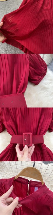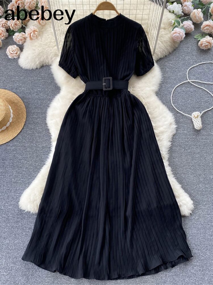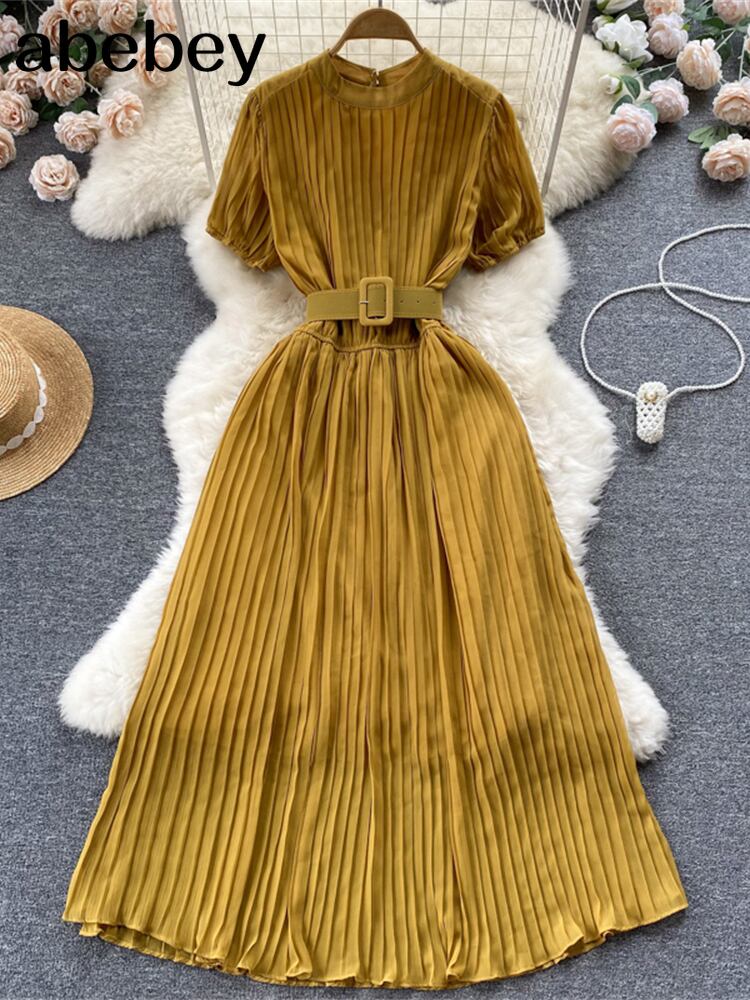 夏の女性プリーツロングドレスラウンドネック半袖ウエストAラインドレープマキシVestidosベルトローブ付き ショート ハーフスリーブ サマー 夏物 ハーネス Oネック Abe14969598176