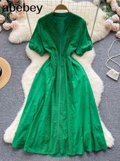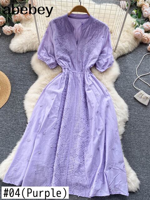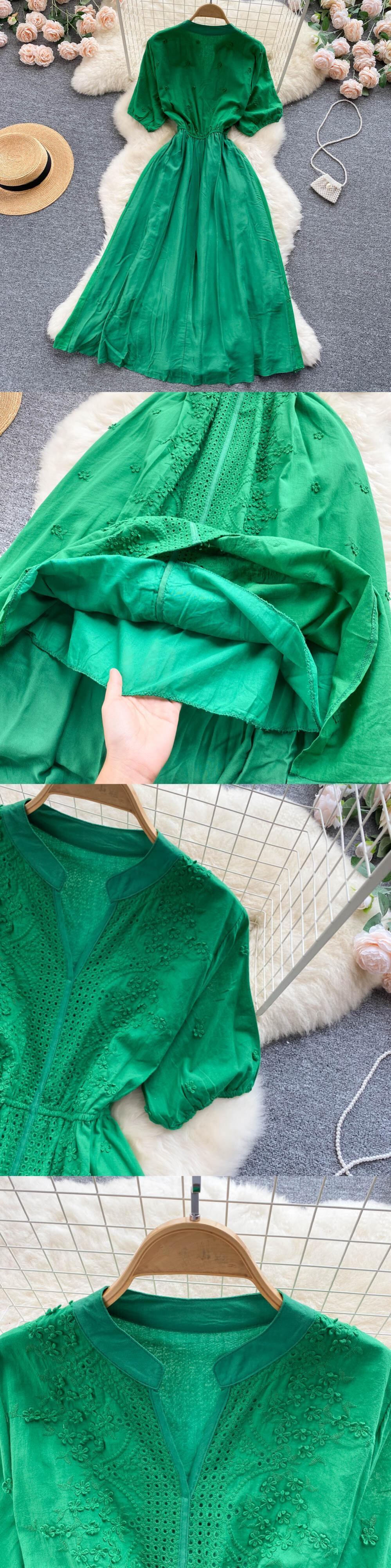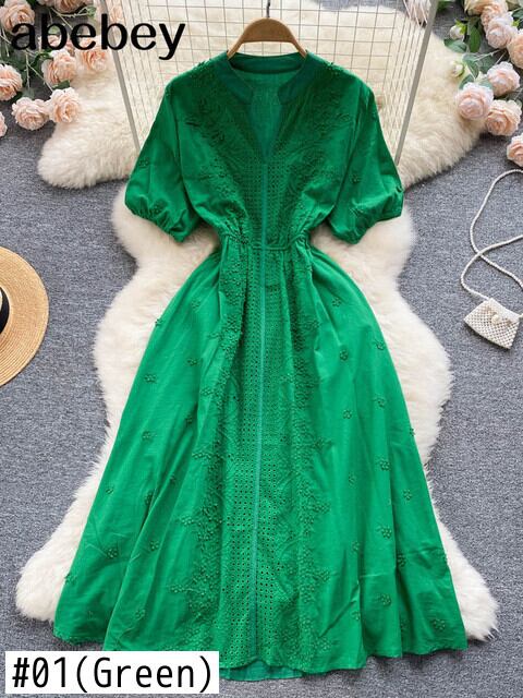 夏のセクシーな中空アウトレースロングドレス女性グリーン/ブルーVネックパフ半袖Aラインパーティーマキシローブ ショート ハーフスリーブ サマー 夏物 Abe58292256957