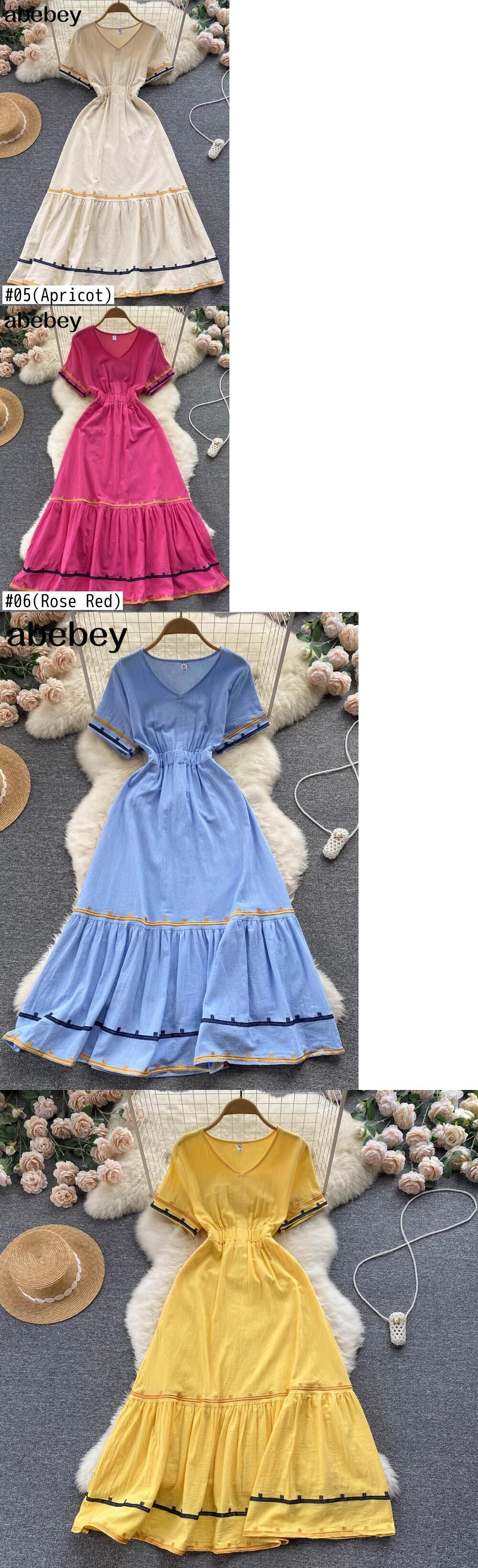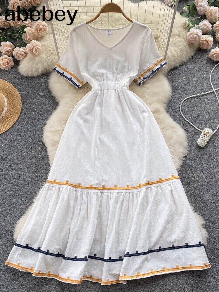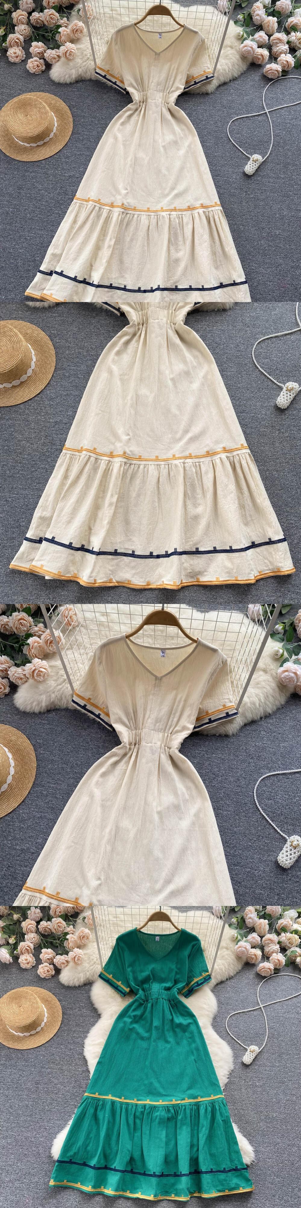 2022ボヘミアン刺繍マキシロングドレスサマーVネックドローストリング半袖ルーズベスティドスグリーン/イエロー/ホワイトドレス ショート ハーフスリーブ 夏物 Abe89151124781
