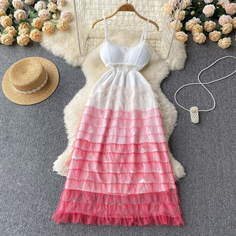 2022セクシーメッシュグラデーションビーチマキシロングドレス女性スパゲッティストラップフリルローブ夏バックレス衣装 サマー 夏物 Abe6824994286