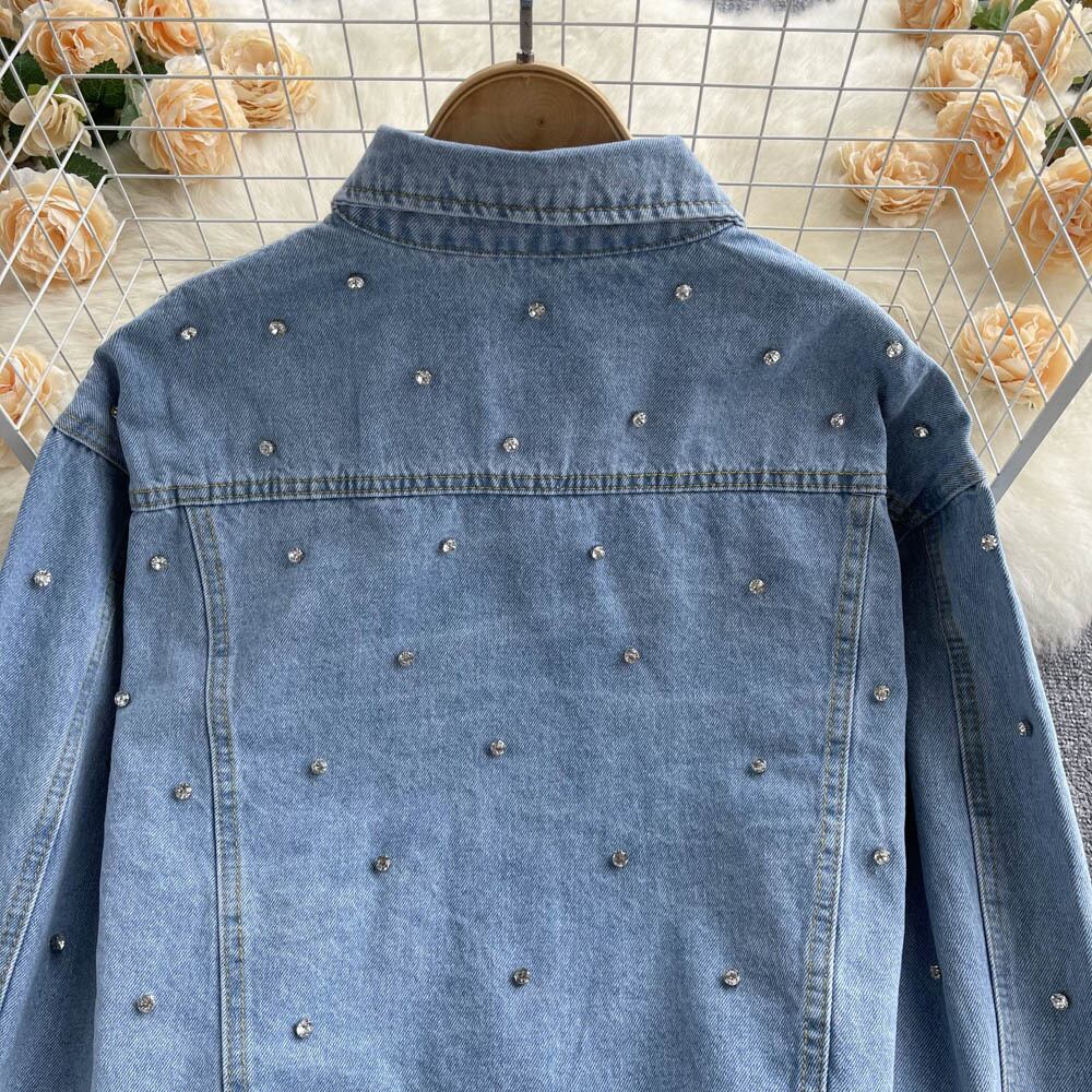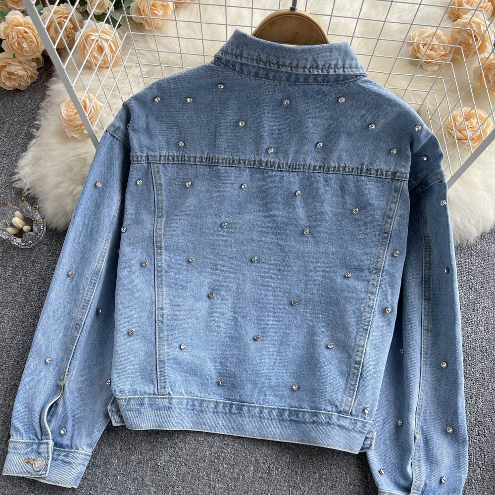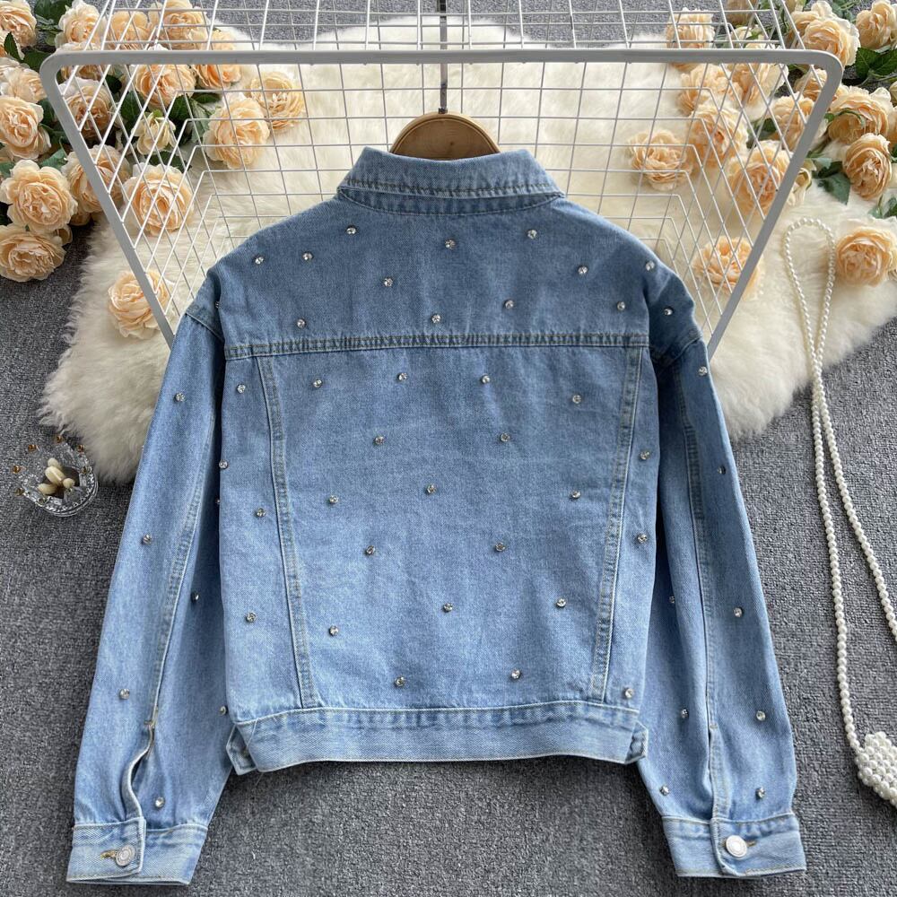パールビーズブラックショートジーンズジャケットChiストリートジーンズジャケットChiコットンカラーブルーホワイトクロップドデニムコート 真珠 Abe11443418417