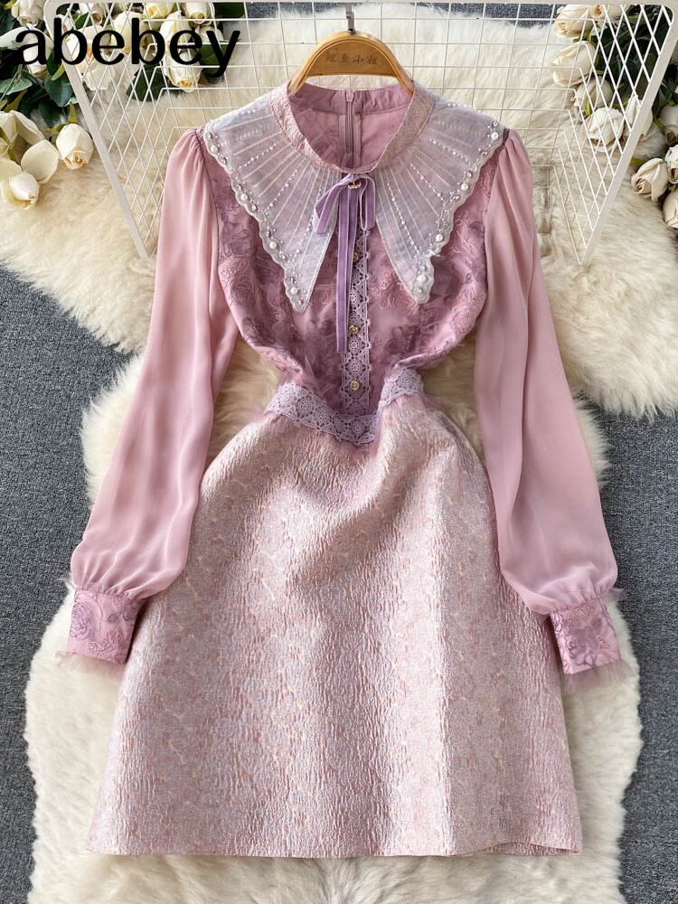 女性ランタンスリーブスリムビーズレースパッチワークドレス滑走路フリルピンクツイードドレスVestidos ラッフル Abe72354751706