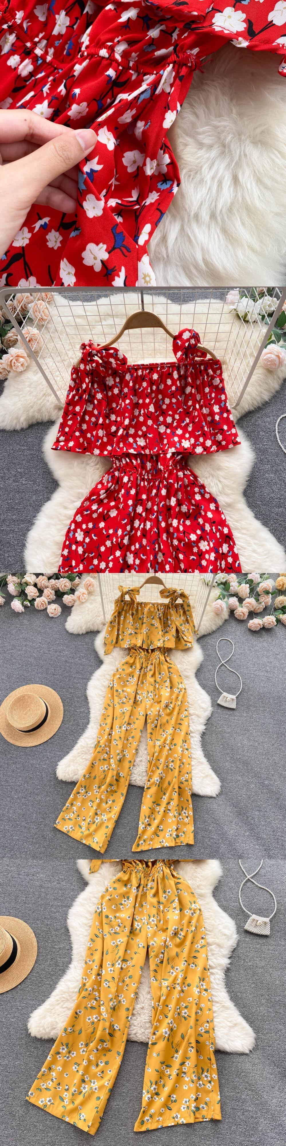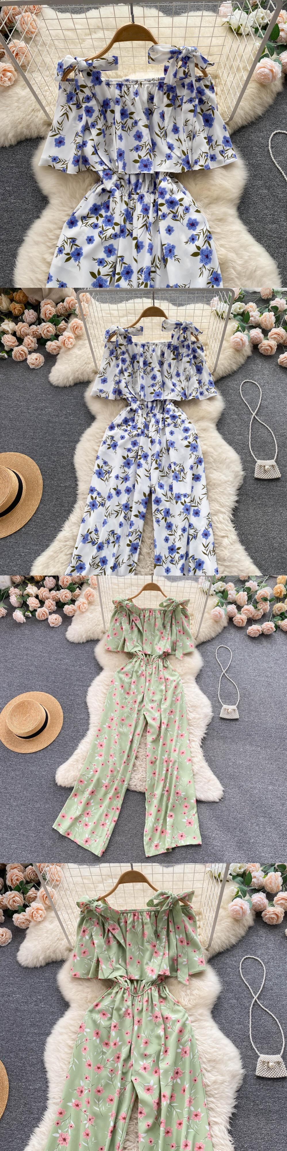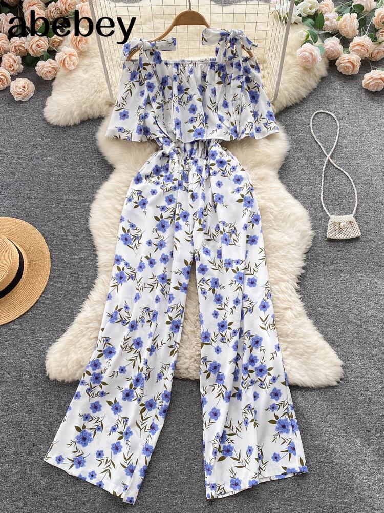 女性のジャンプスーツロンパース夏の花柄プリントオフショルダーフリルレースアップワイドレッグホリデールーズジャンプスーツ ラッフル サマー 夏物 ワイドパンツ Abe88221366618