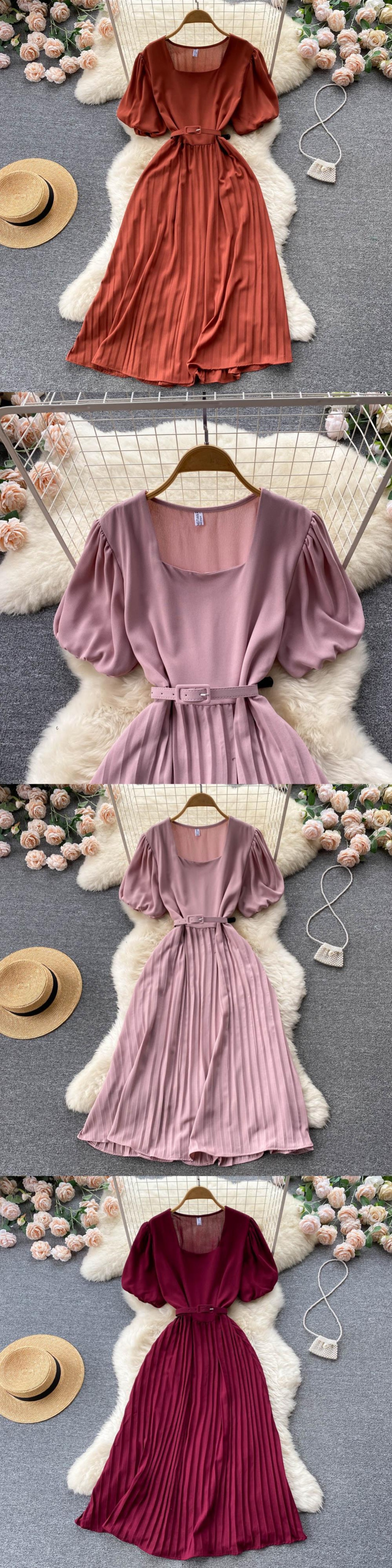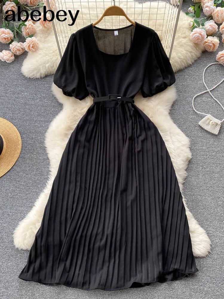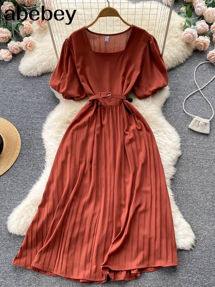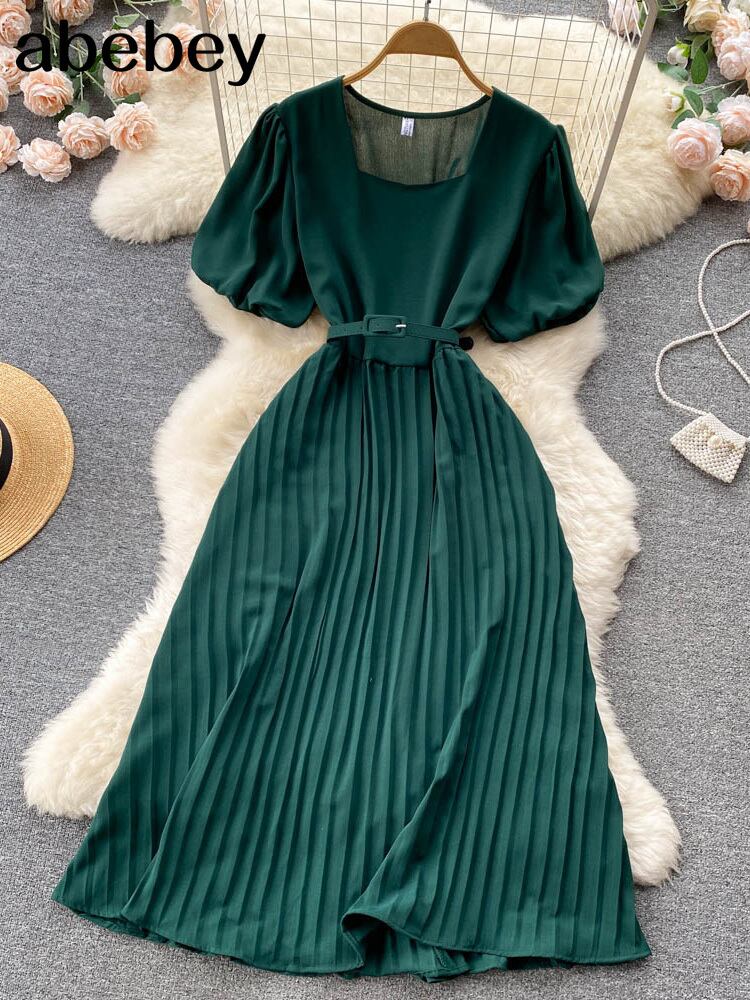 グリーンミディレトロドレスレディース2022ソリッドカラーレースアップウエストスリムミディプリーツドレスオフィスレディvestidosdemujer 会社 学校 通勤や通学にも Abe6227282191
