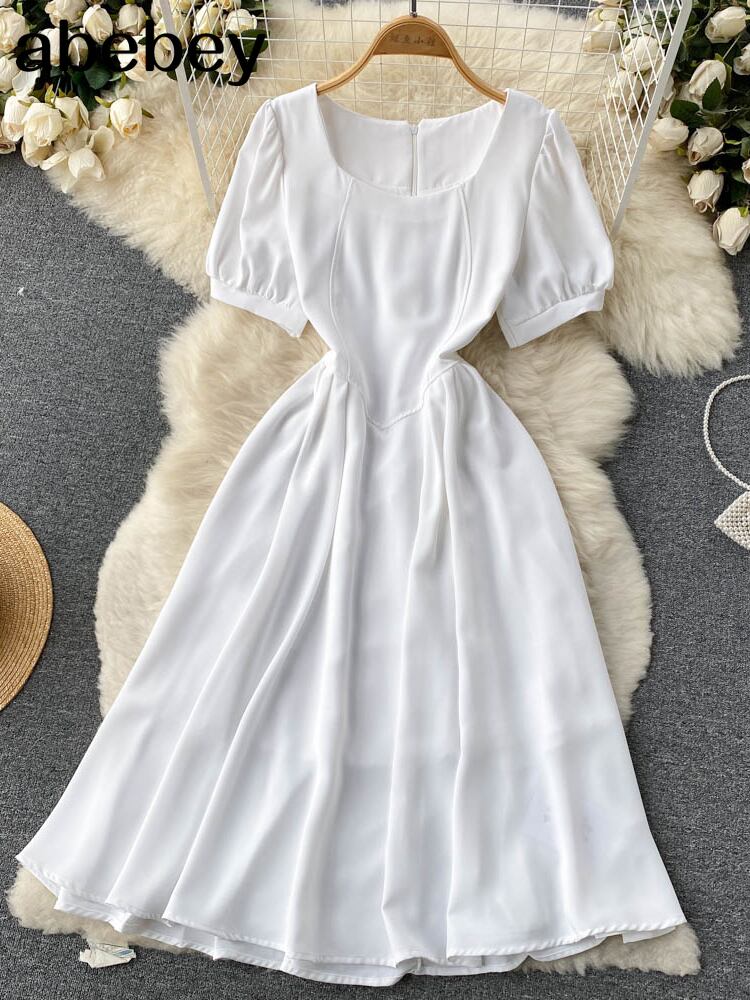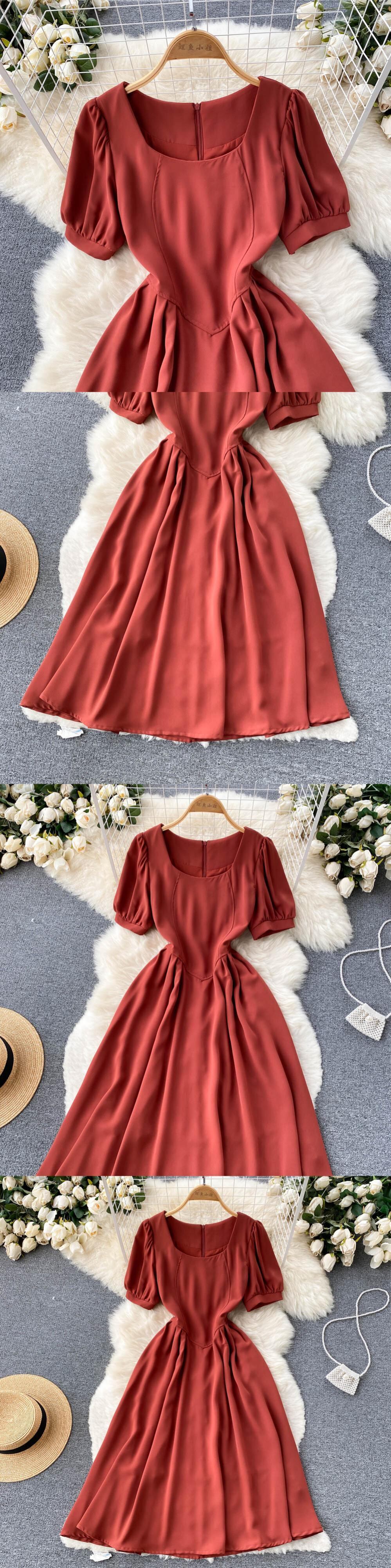 女性プリーツフレンチスタイルドレススクエアネックソリッドバケーション気質2022Aラインスリムドレス ソリッドカラー スクウェア Abe21810040965