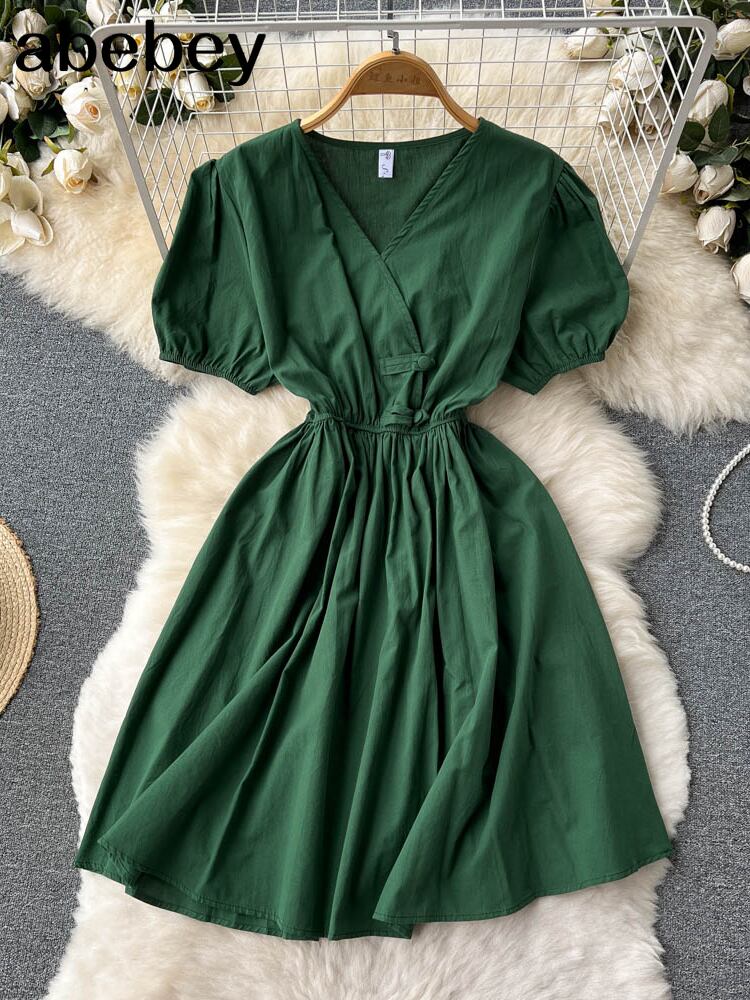 緑のドレス女性ミニVestidosロマンスシックなチュニック甘い夏の休日フレンチスタイルシングルブレストサンドレス 大人ガーリー スウィート キュート カジュアル サマー 夏物 グリーン Abe64439434426