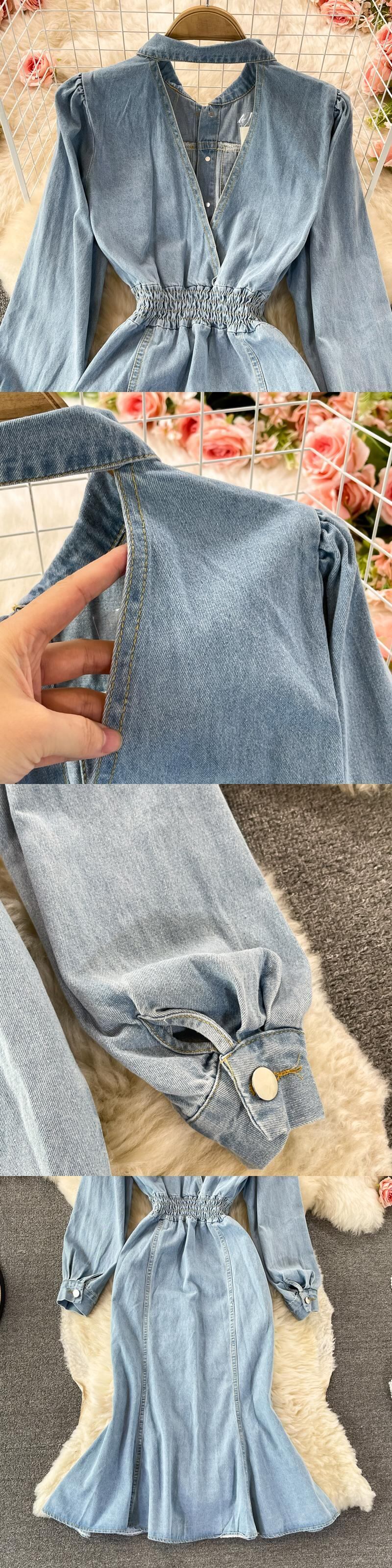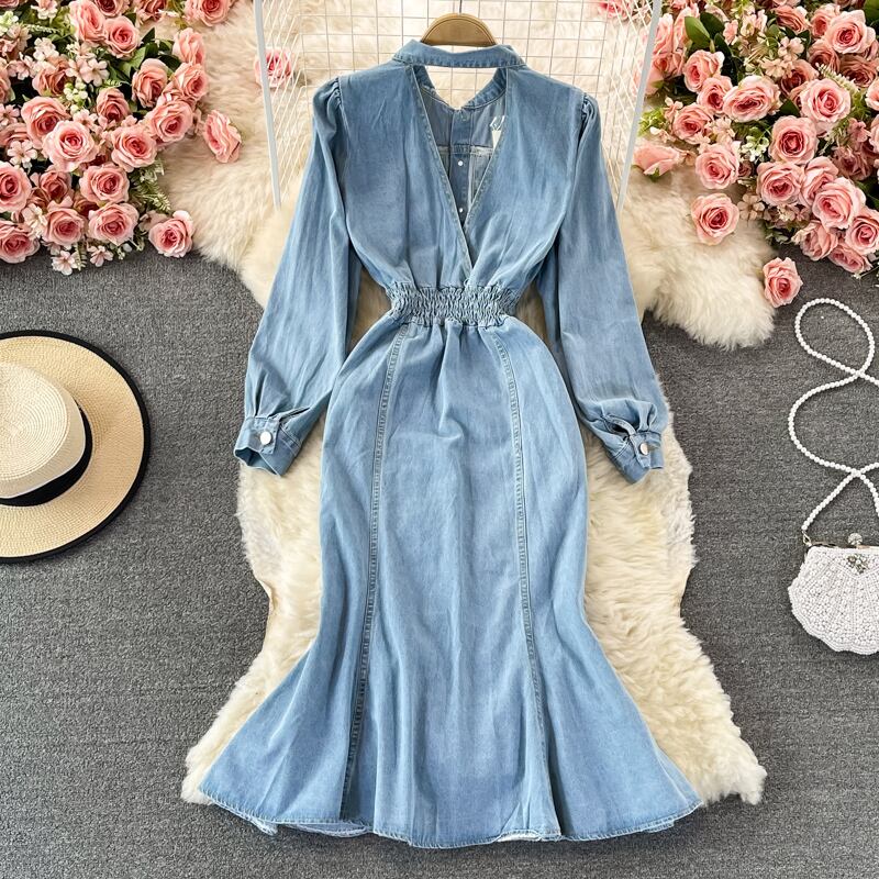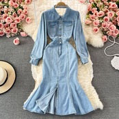 女性秋ターンダウンカラーデニムマーメイドロングドレス長袖スリム伸縮性ウエストシングルブレストカウボーイフィッシュテールドレス エラスティック オータム 秋物 Rhc81726533540
