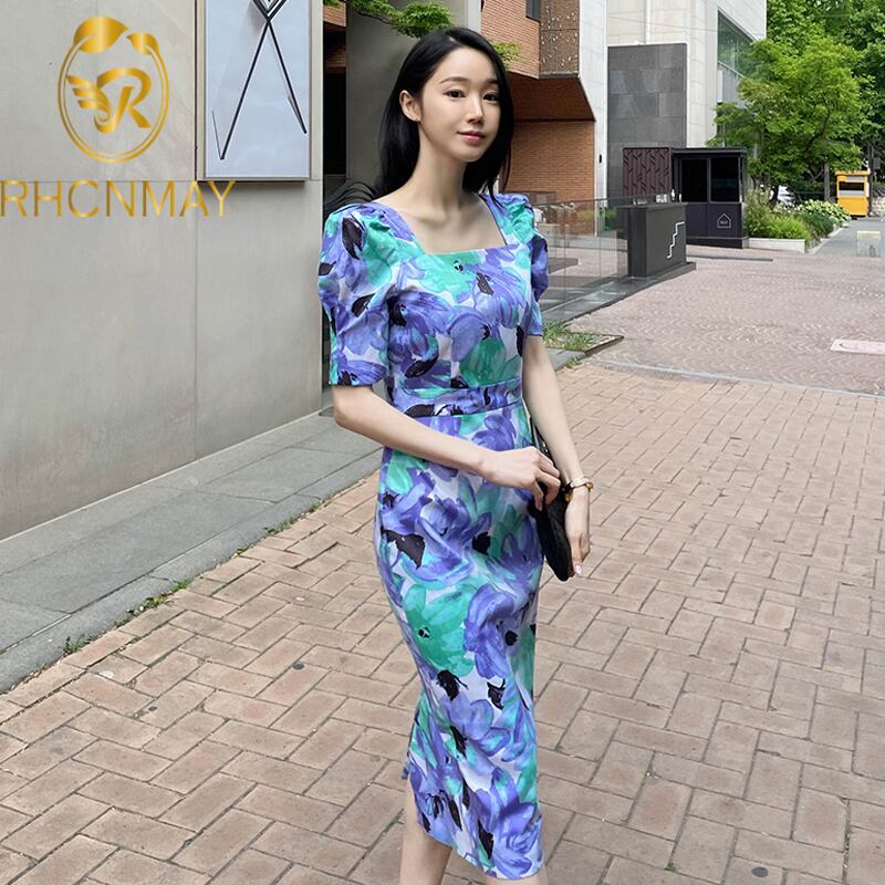 スクエアネックロングフラワープリントワンピースレディースウエストパフスリーブ夏 サマー 夏物 フラワーデザイン スクウェア Rhc97464912211