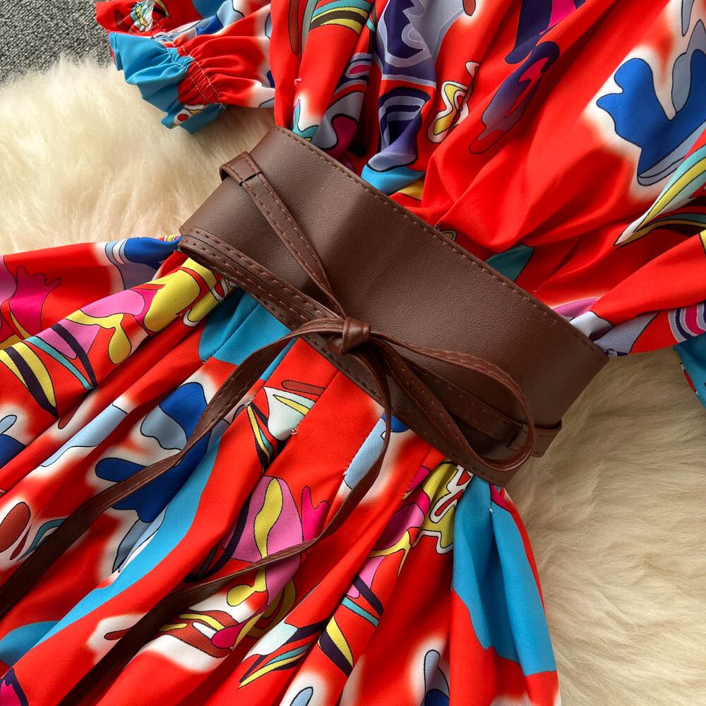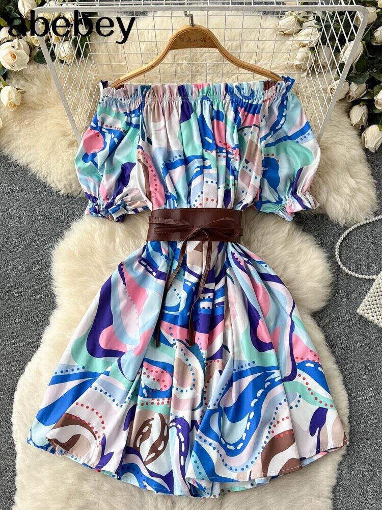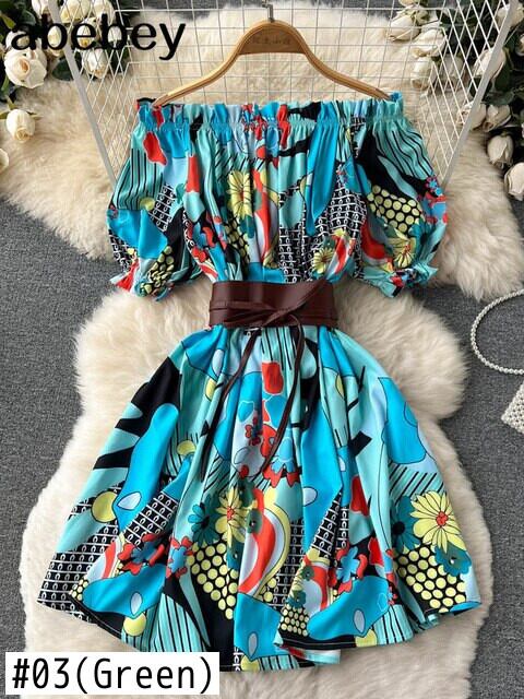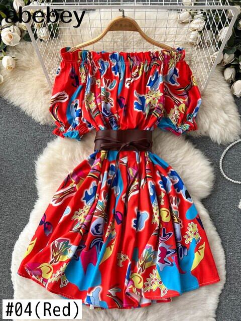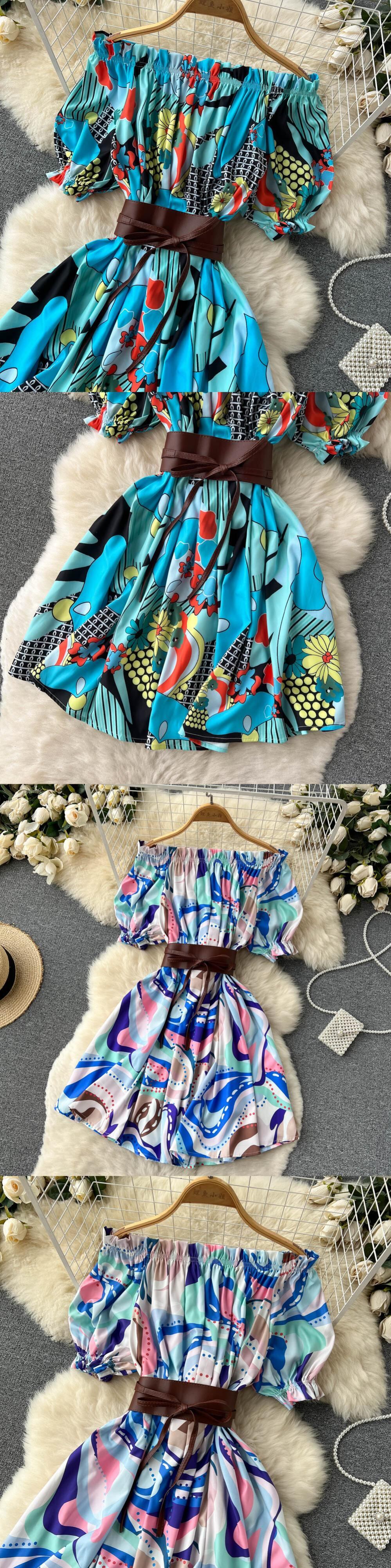 夏フレンチフローラルドレス女性スウィートセクシースラッシュネックオフショルダーAラインミニドレス自由奔放に生きるプリントバケーションビーチサンドレス 大人ガーリー キュート カジュアル サマー 夏物 花柄 Abe1385340252