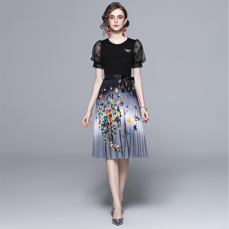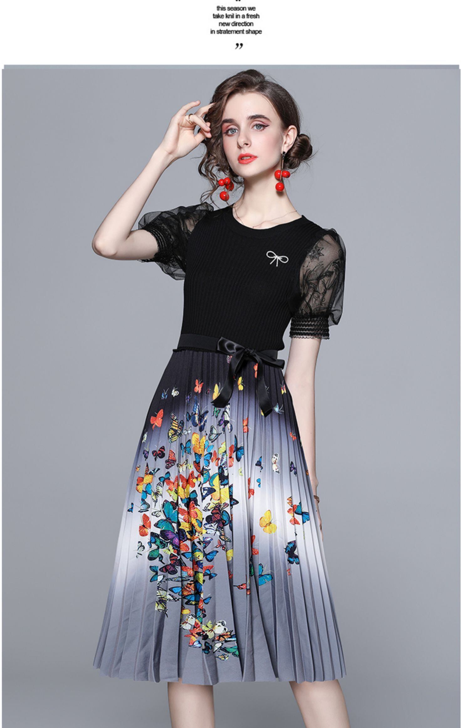 春秋プリーツドレス女性ニットパッチワークフラワープリント長袖オフィスワンピースセータードレスベルト付き ロング スプリング 春物 オータム 秋物 ハーネス フラワーデザイン 会社 学校 通勤や通学にも Rhc74131550678
