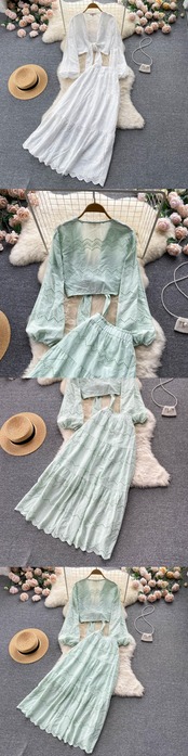 2022年夏のツーピースセット女性のための自由奔放なビーチスカート2個セットレースランタンシーブクロップトップとロングプリーツスカート サマー 夏物 Abe15563801832