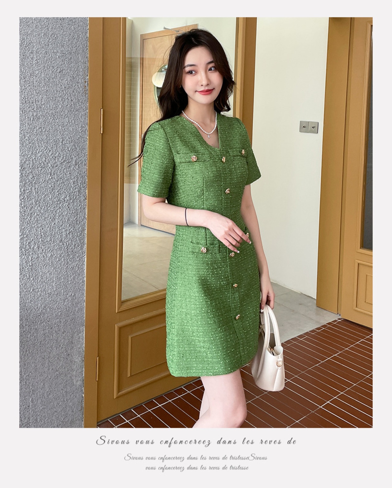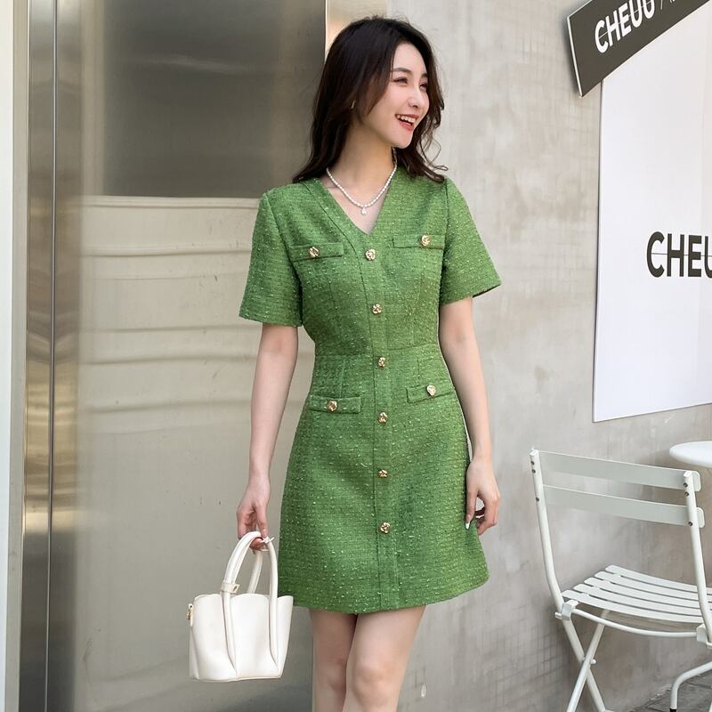 女性の甘いツイードドレス夏のVネックAラインスモールフレグランススタイルグリーンパーティードレスシックな服 大人ガーリー スウィート キュート カジュアル サマー 夏物 Rhc44857190601