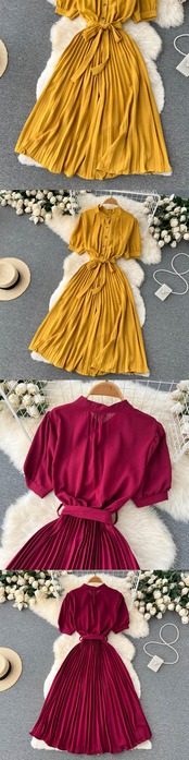 シングルブレスト女性プリーツドレス半袖スリムウエストAラインドレスロング Abe82581614413