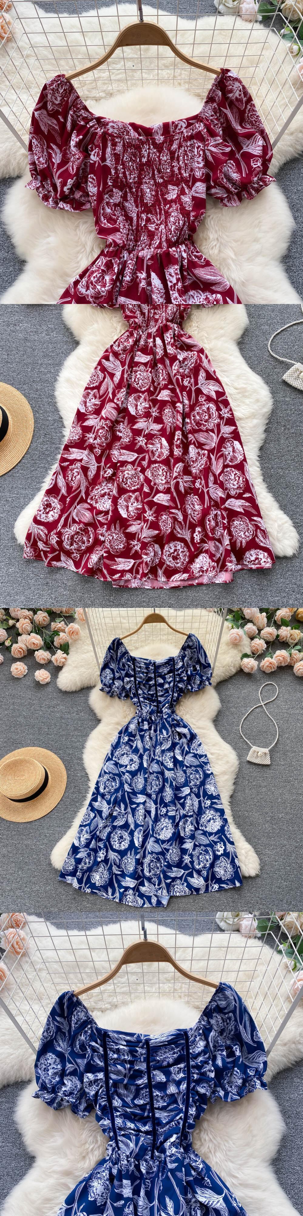 女性サマーパーティードレスレディフランススタイルパフスリーブフローラルプリントスクエアカラーミディドレス服 夏物 花柄 スクウェア Abe4183181515