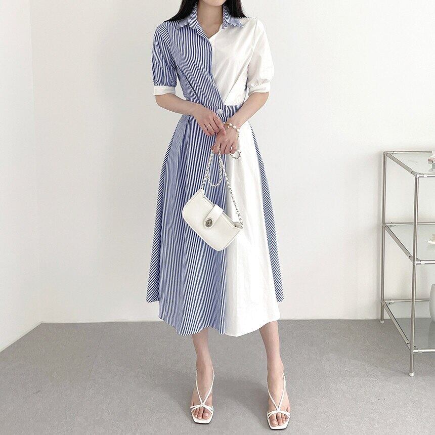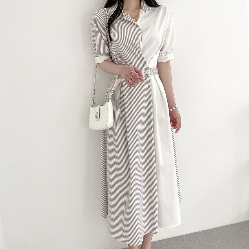 ワンボタンレディースロングドレスサマーコントラストカラーストライプパッチワークドレススタイリッシュなVestidos 夏物 Rhc62912563191