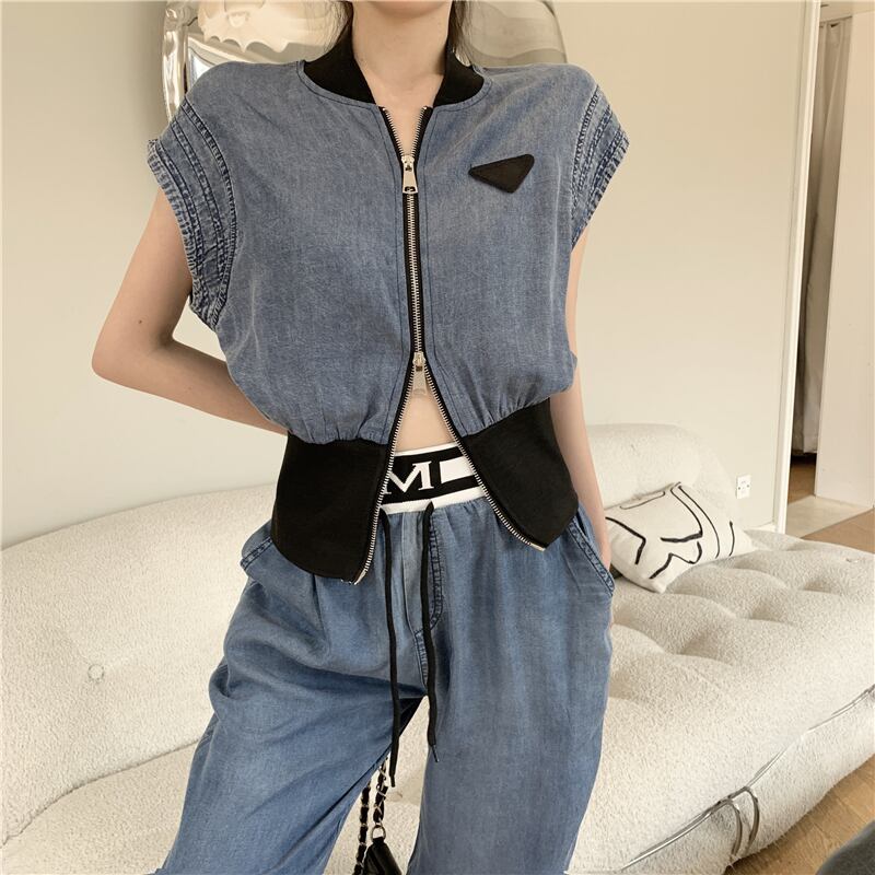 ヨーロピアンジーンズベストツーピースセットウィメンズ2022サマーデニムベストジッパートップ+ワイドレッグデニムパンツ2ピースセット 夏物 ワイドパンツ Rhc53568908513
