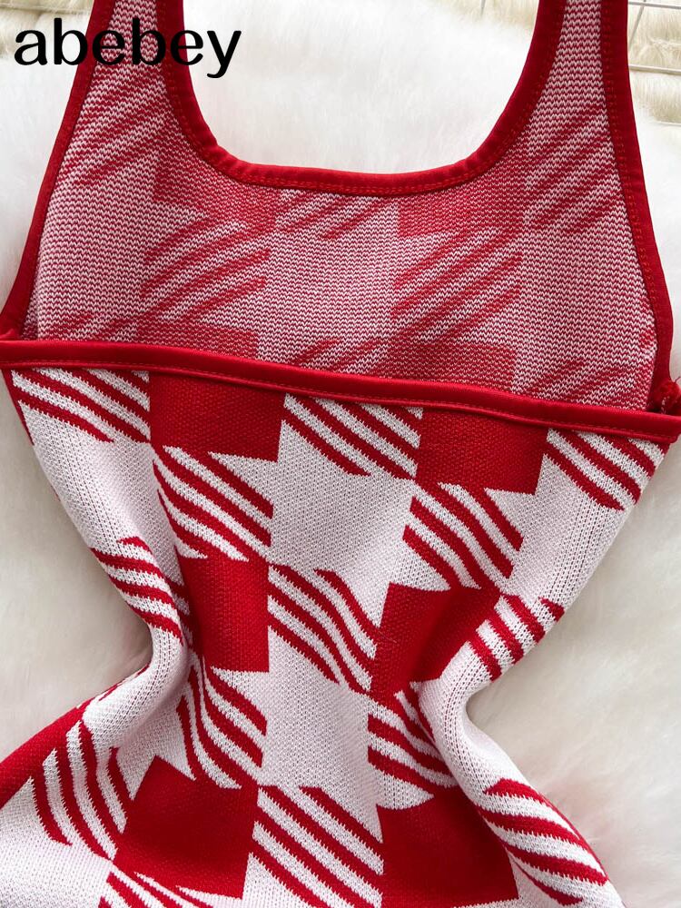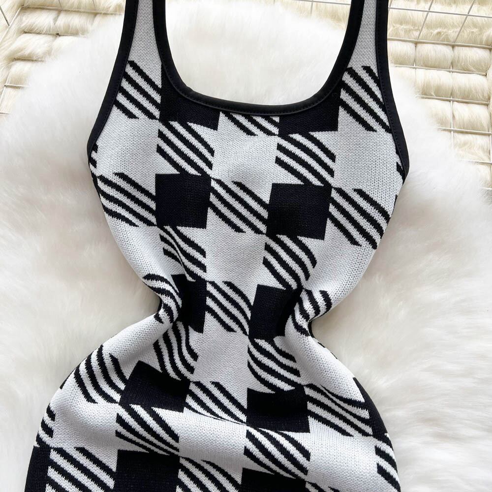 Insチェック柄ニットレディースドレス2022サマーホルターノースリーブボディコンドレスヨーロッパスタイルのオフィスドレス 夏物 会社 学校 通勤や通学にも Abe10270523848