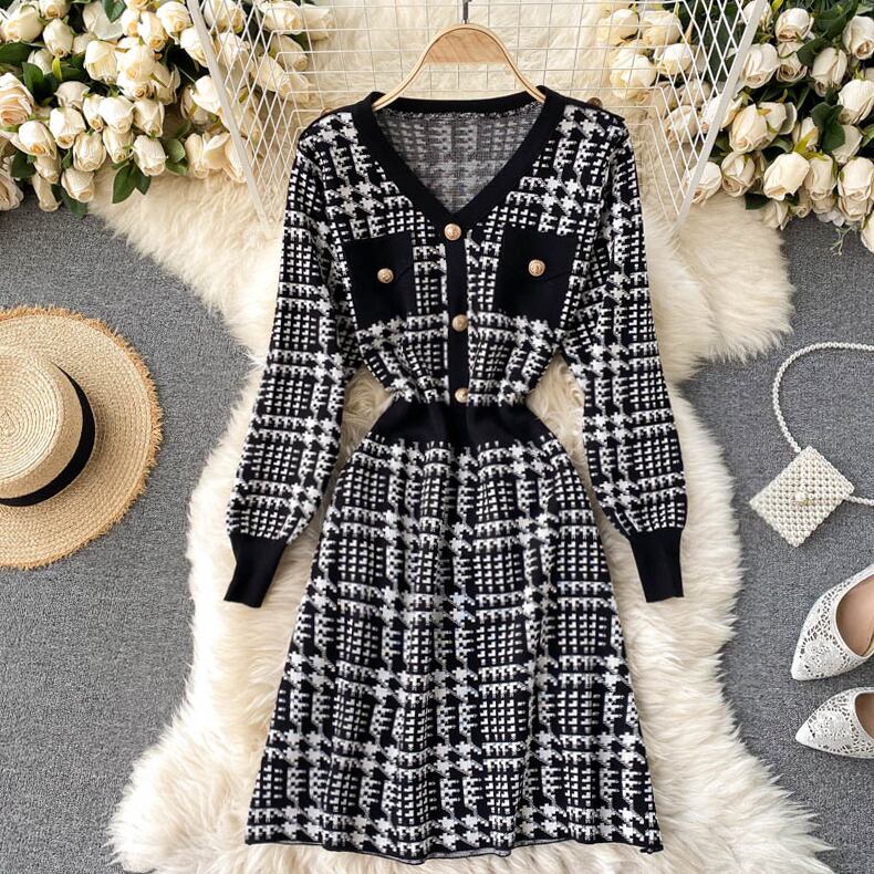 秋の冬のドレス女性パッチワーク格子縞のドレス滑走路Aライン編み物セータードレス オータム 秋物 ウィンター 冬物 Rhc91097670017