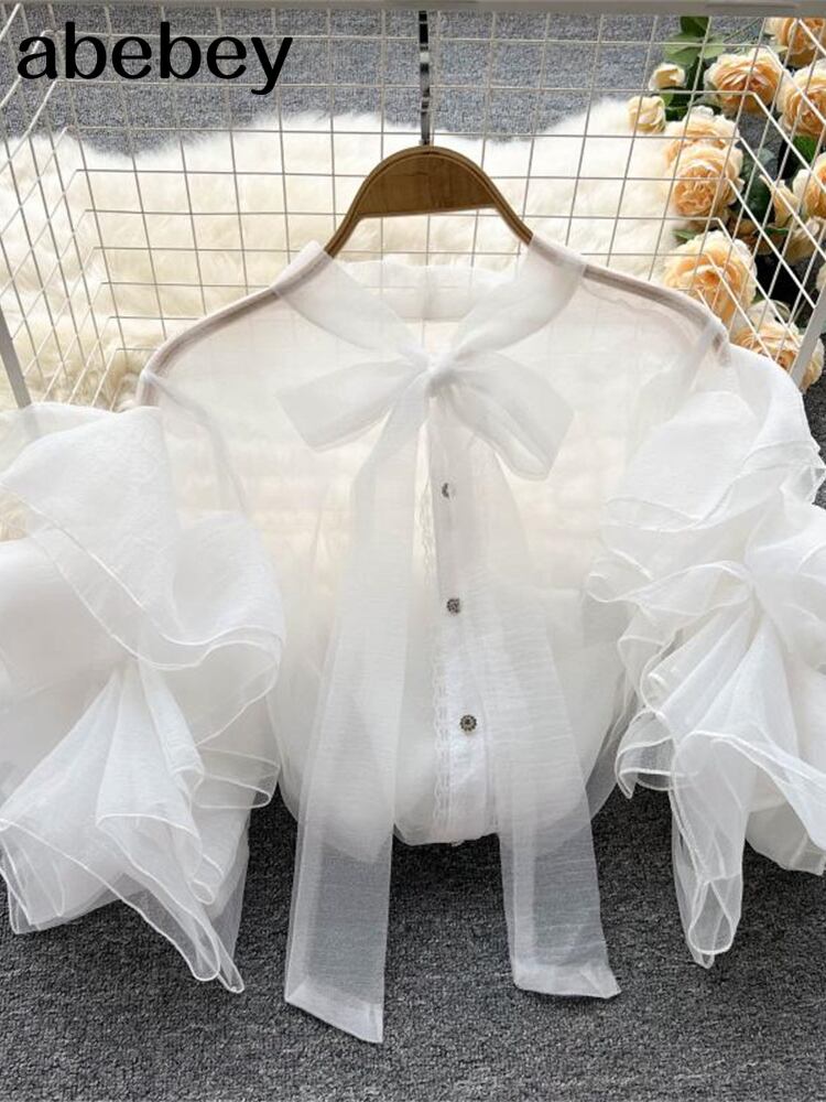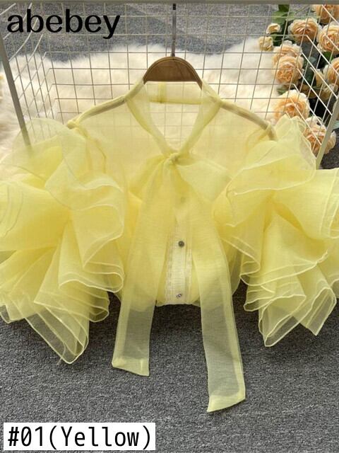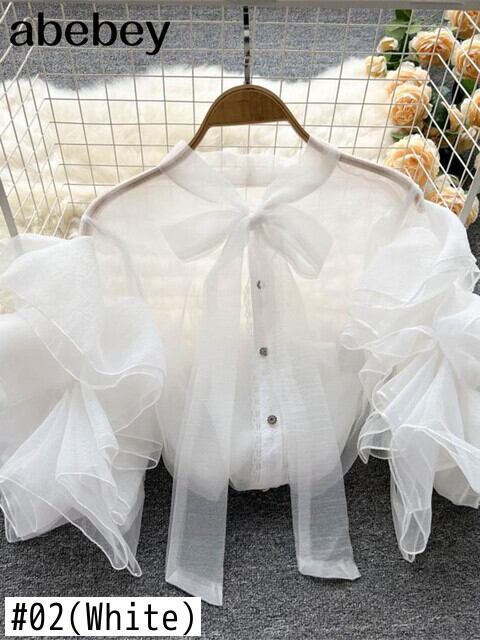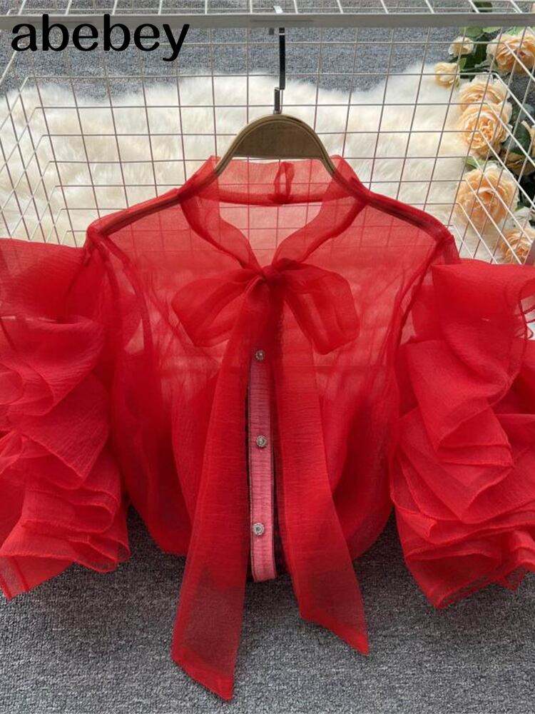セクシーなカスケードフリルボウシャツ女性ブラウス2022夏シースルーボタンアップトップス赤ピンク白 ホワイト レッド リボン ラッフル サマー 夏物 Abe58667981973