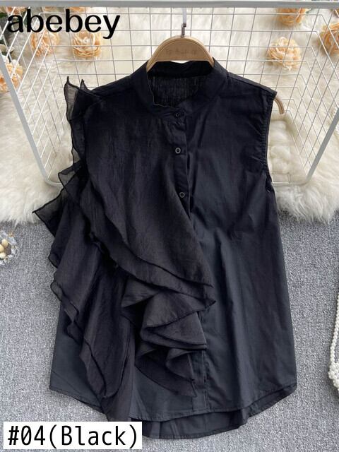レディースシャツフレンチフリルブラウスセクシープリーツOネックサマーノースリーブスリムトップスホワイト ラッフル 夏物 Abe89610918906