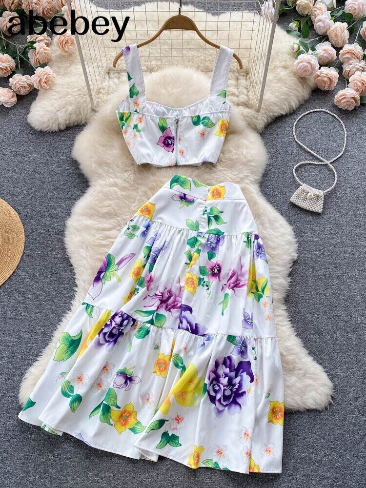 女性サマーフローラルセットセクシーストラップトップス+ロングプリントロングスカートビーチスーツホリデーエラスティックウエストツーピースセット衣装 伸縮 夏物 花柄 Abe57699448387
