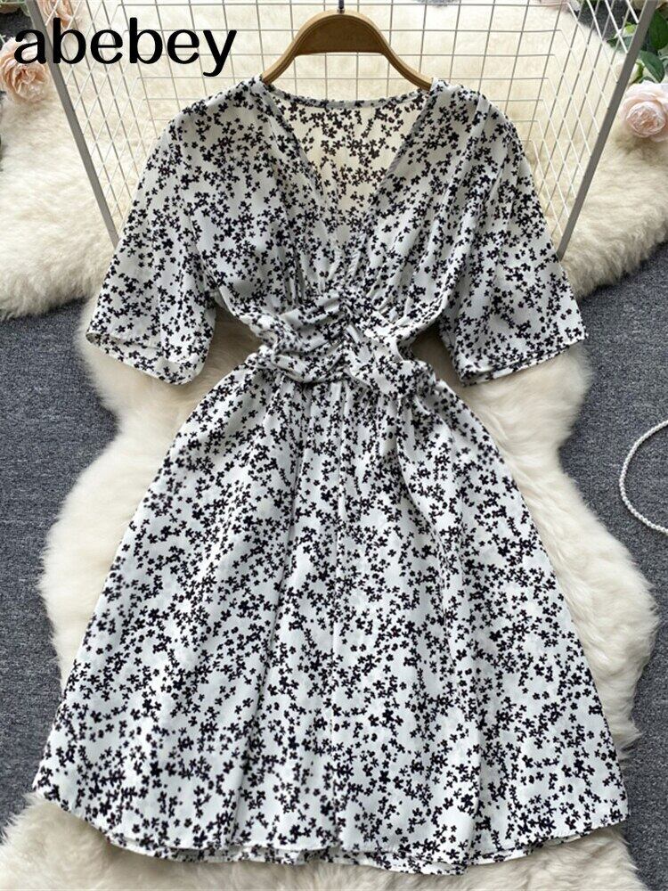 夏AラインドレスVネックフローラルプリントミニドレスフレア半袖ボタンパーティードレスVestidoDeMulher ショート ハーフスリーブ サマー 夏物 花柄 Abe4395225391