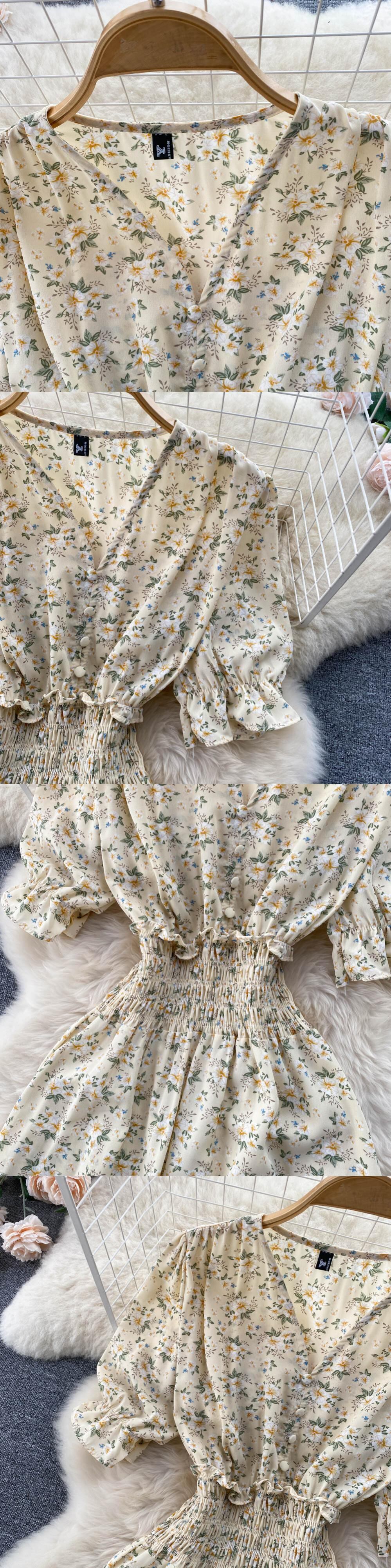 ボタンフローラルプリントVネックロングドレスサマーパーティー伸縮性ウエストドレスレディースエレガントチュニックスプリットビーチドレス エラスティック 夏物 花柄 Abe66090807043