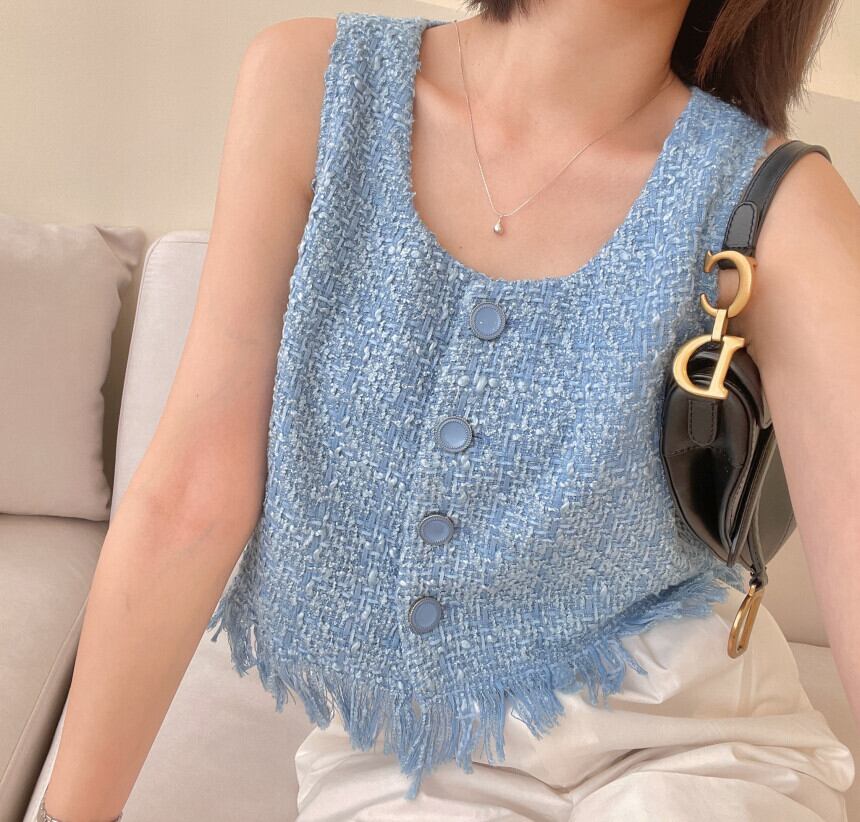 テルツイードタンクトップレディースサマースクエアカラーシングルブレストブラウスシックシンプルオールマッチベストトップス 夏物 スクウェア Rhc81951371067