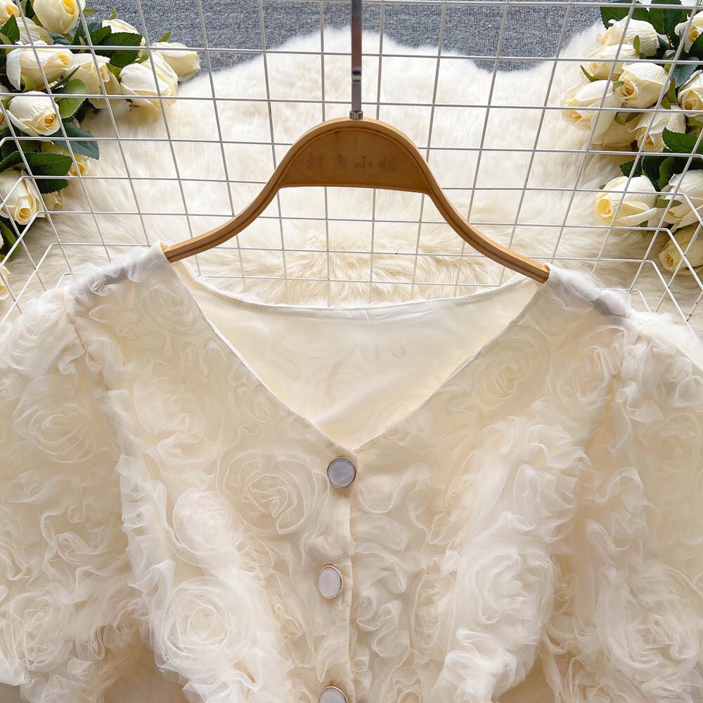 パフスリーブシャツホワイトピンクオールマッチブラウスVネックオフィスブルーサクロップトップス 会社 学校 通勤や通学にも Abe51379414468