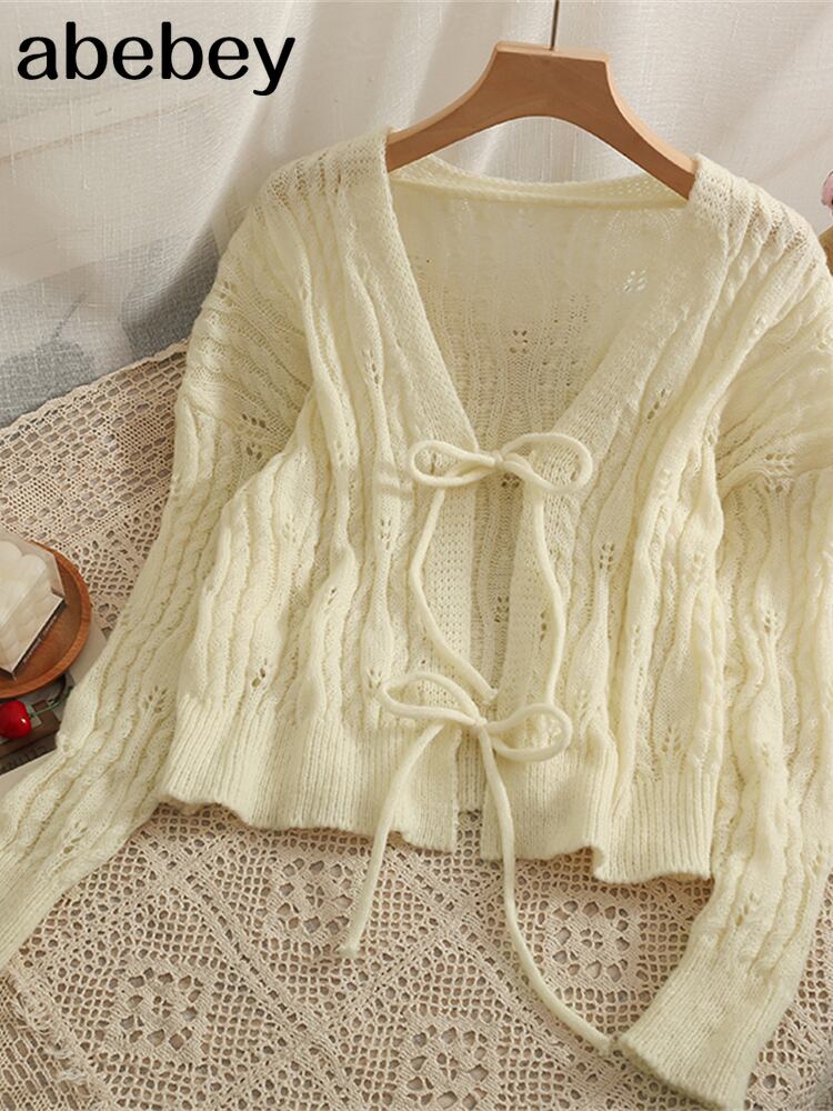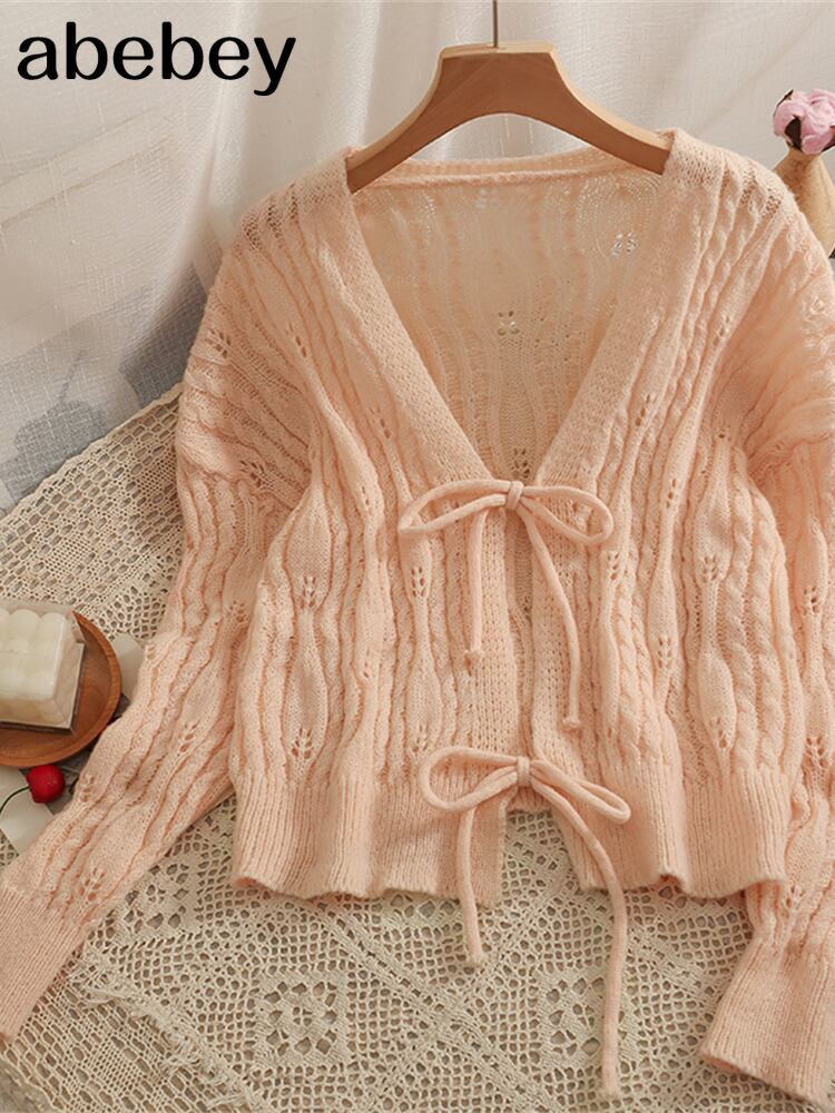 ニットカーディガンスタイル長袖カーディガン女性蝶巾着セーター無地甘いセーター無料 ロング 大人ガーリー スウィート キュート カジュアル ソリッドカラー Abe35952581306
