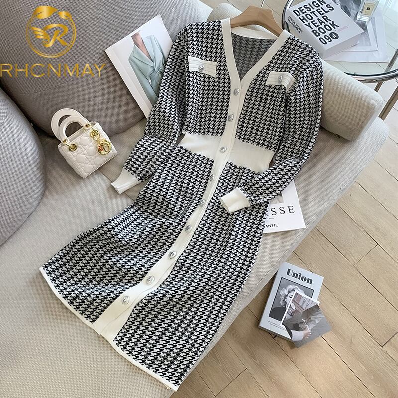 2022年秋冬Vネック長袖ニットワンピース千鳥格子プリントシングルブレストウエストロングラップワンピース オータム 秋物 ウィンター 冬物 Rhc77367714737