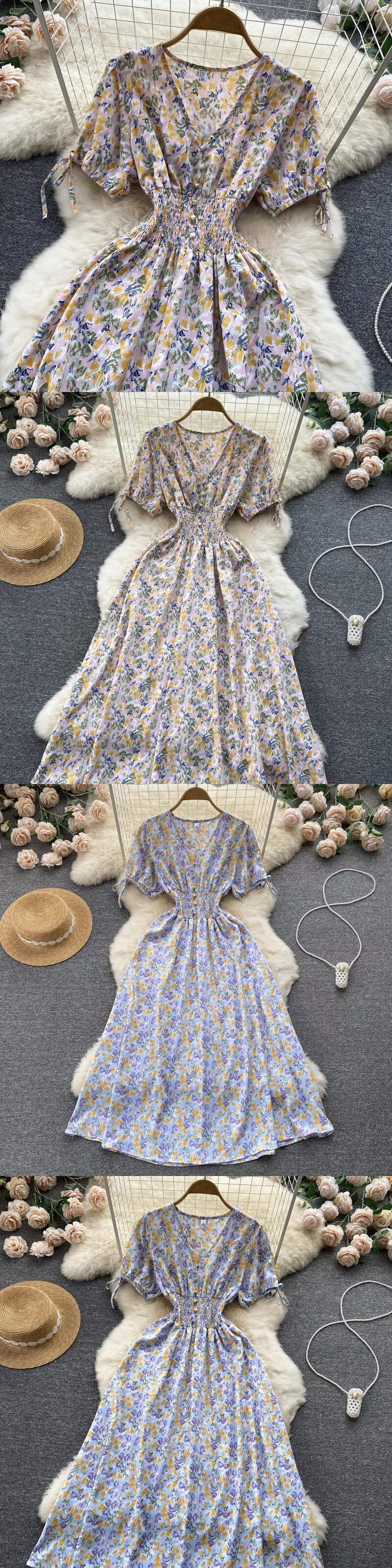 夏のプリント花柄ドレス女性 V ネックシフォンボヘミアンドレスビーチ不規則なラップミディロングドレス 2022 サマー 夏物 Vネック Abe34356906805