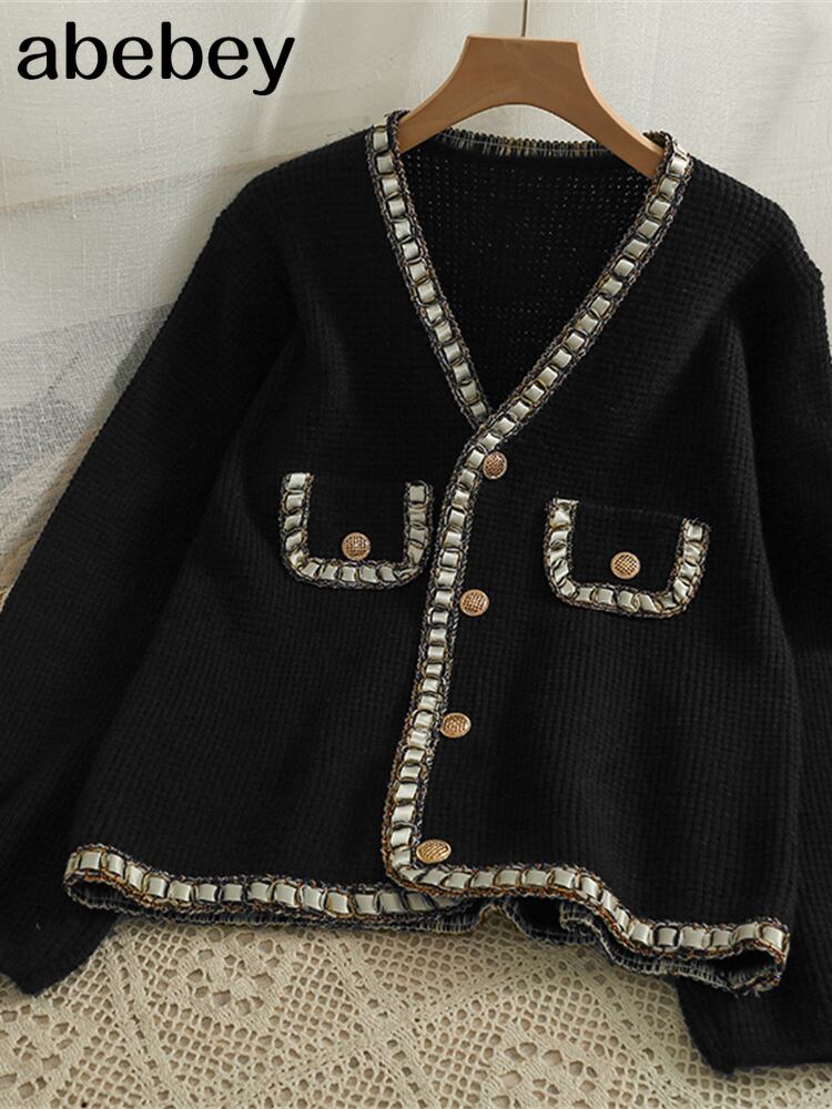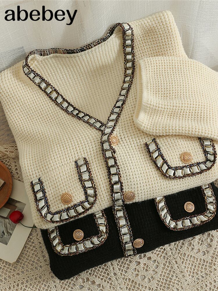 長袖Vネックプレッピースタイルニットセーター女性秋シングルブレストコットンウォームカーディガンパッチワークグレーロングセーターコート オータム 秋物 Abe9399337465