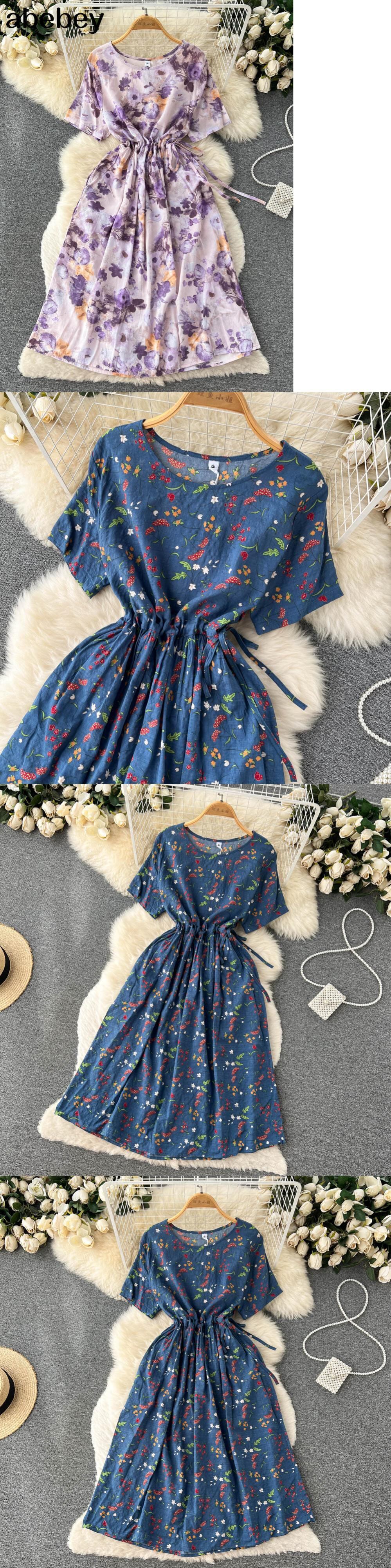 グリーンサマーウーマン 2022 ドレスボヘミアンフローラルプリントホリデーローブ Vestidos O ネック半袖ミディサンドレス ショート ハーフスリーブ 夏物 花柄 Oネック Abe5521502632