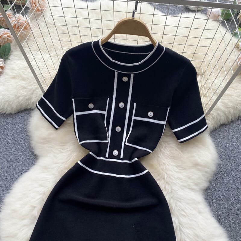 女性夏フレンチフレグランスドレスオフィス半袖OネックウエストAラインニットドレス2022 ショート ハーフスリーブ サマー 夏物 会社 学校 通勤や通学にも Abe66465585973