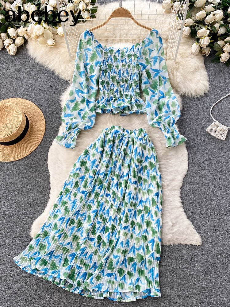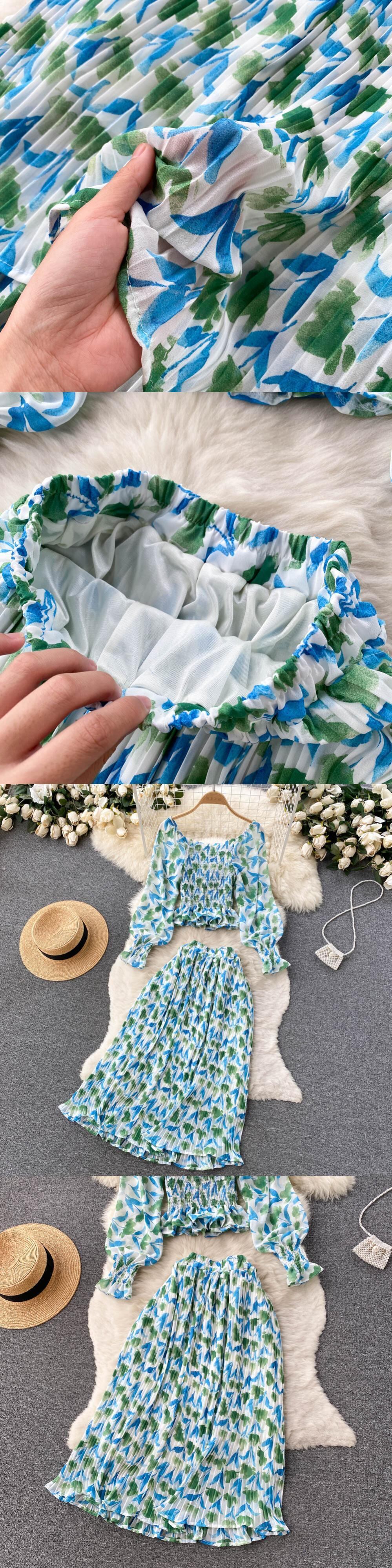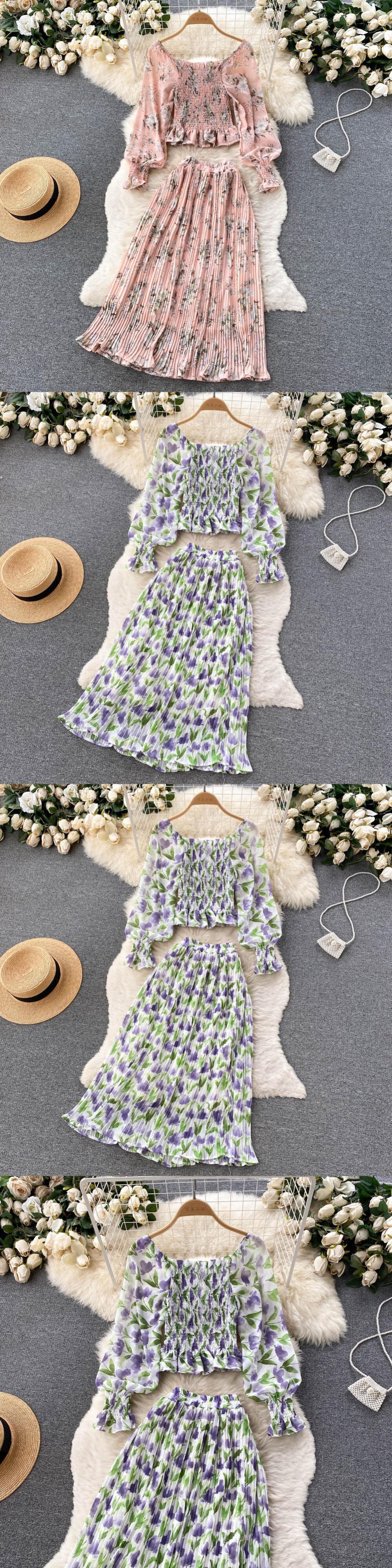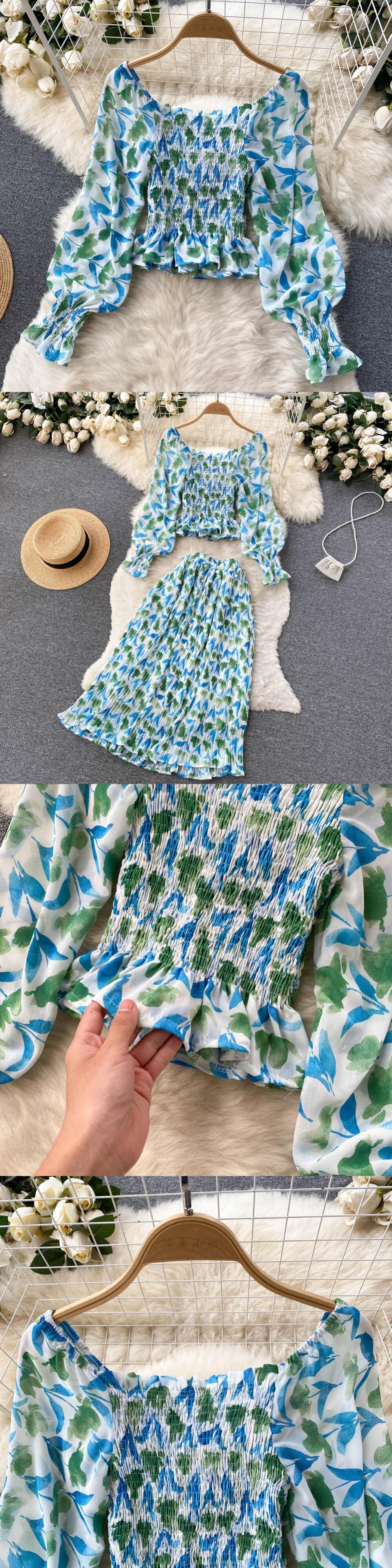 女性プリント シフォン 2 点セット スクエア カラー ランタン スリーブ ブラウス + ウエスト プリーツ スカート スーツ衣装 ランタンスリーブ スクウェア Abe83793020485