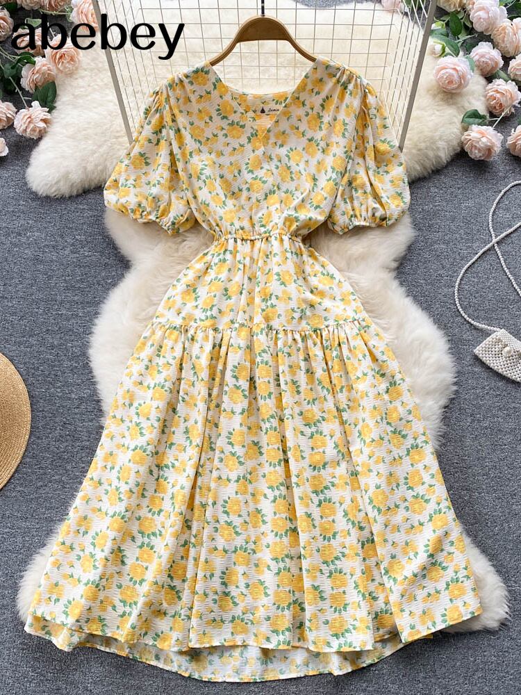 ボヘミアン女性花柄プリントロングドレスセクシーな V ネック半袖ウエストフリルビーチ休暇 Vestidos マキシローブ ショート ハーフスリーブ Vネック Abe44457444371