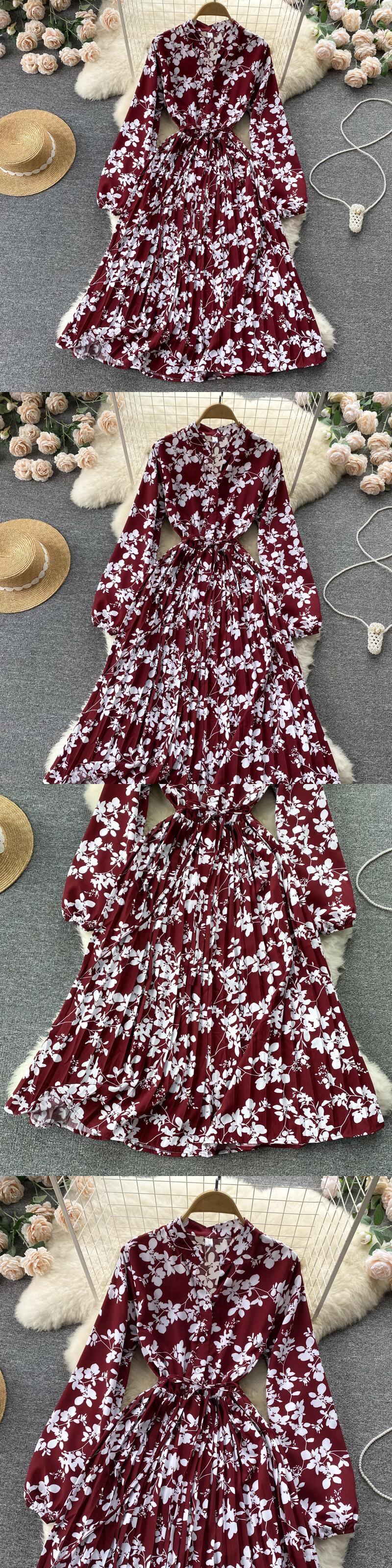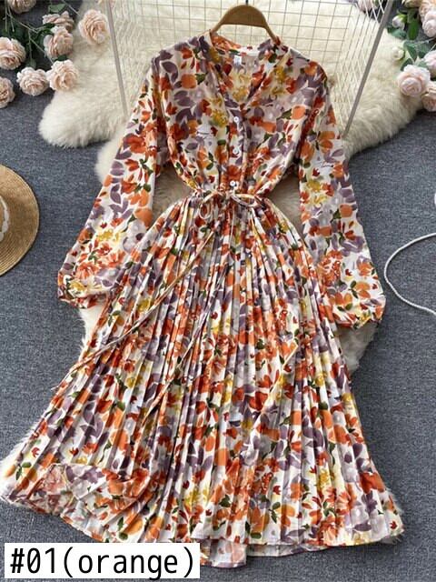 レトロな女性自由奔放に生きるドレス 2022Spring 秋長袖弓プリーツドレス花柄プリントロングローブ Vestidos リボン スプリング 春物 オータム 秋物 Abe6341906701