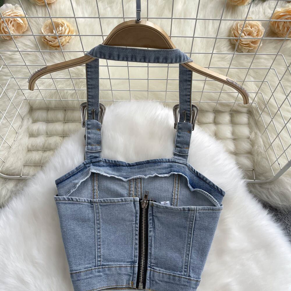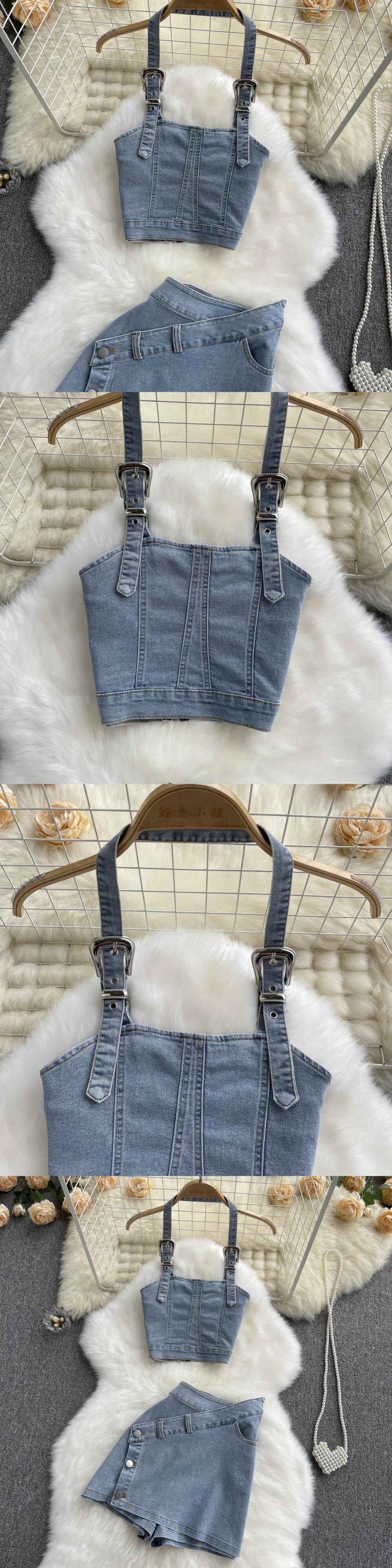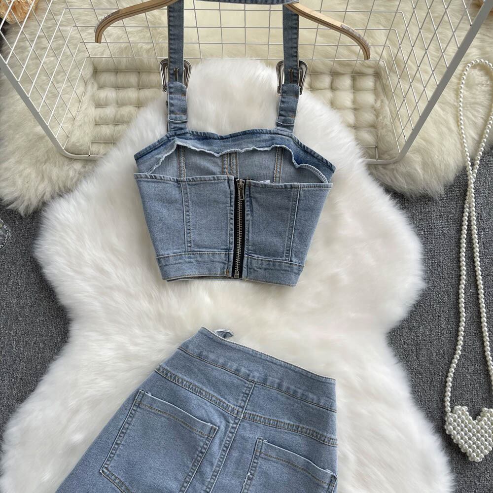 デニムブルーセクシーな女性セットジッパーボタンポケット不規則なストラップレスバックレストップデニムスカートツーピースセット Abe77975953770