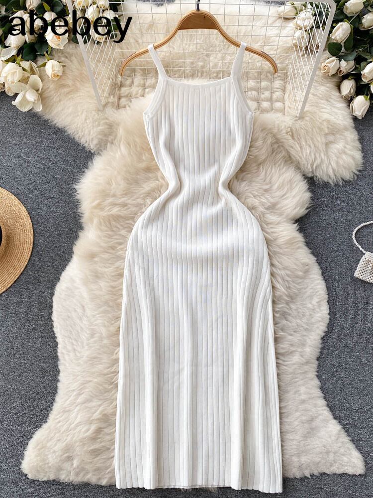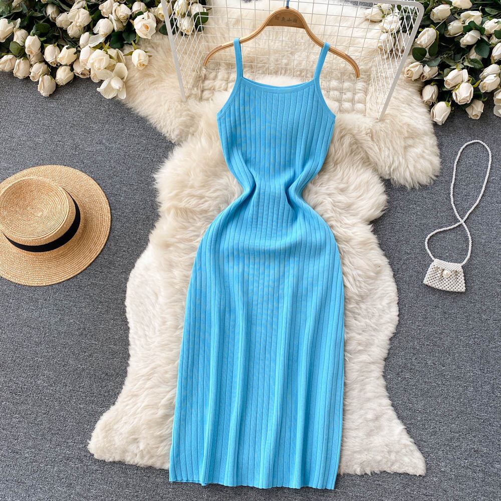 セクシーなバックレス ニット ドレス女性ストラップ ノースリーブ中空アウト ブルー サンドレス バケーション ニット ビーチ ロング ドレス Abe98272802780