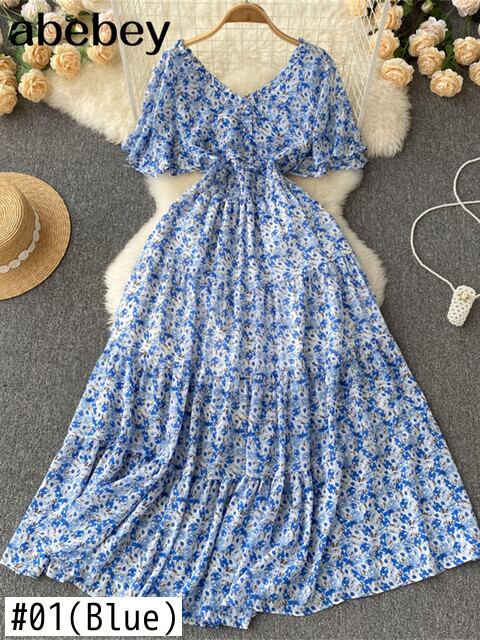 ドレス女性2022Vネックフローラルマキシドレス半袖サマーシフォンプリーツロングドレス衣装 ショート ハーフスリーブ 夏物 花柄 Abe7818142843