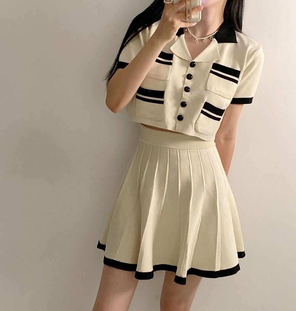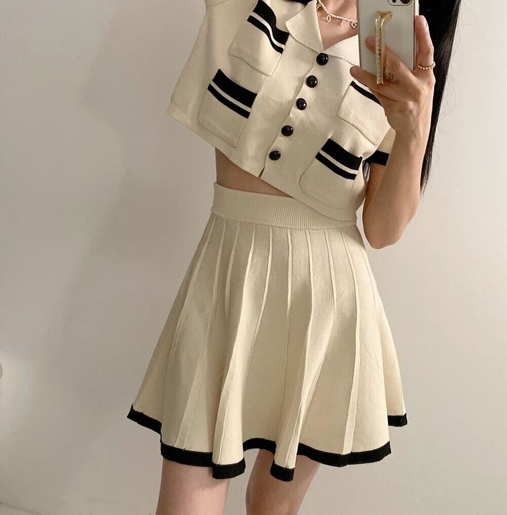 2022年夏 薄手ニットセット ヒットカラー半袖ターンダウンカラーカーディガン+ウエストAラインプリーツスカート ショート ハーフスリーブ サマー 夏物 Rhc32344466491