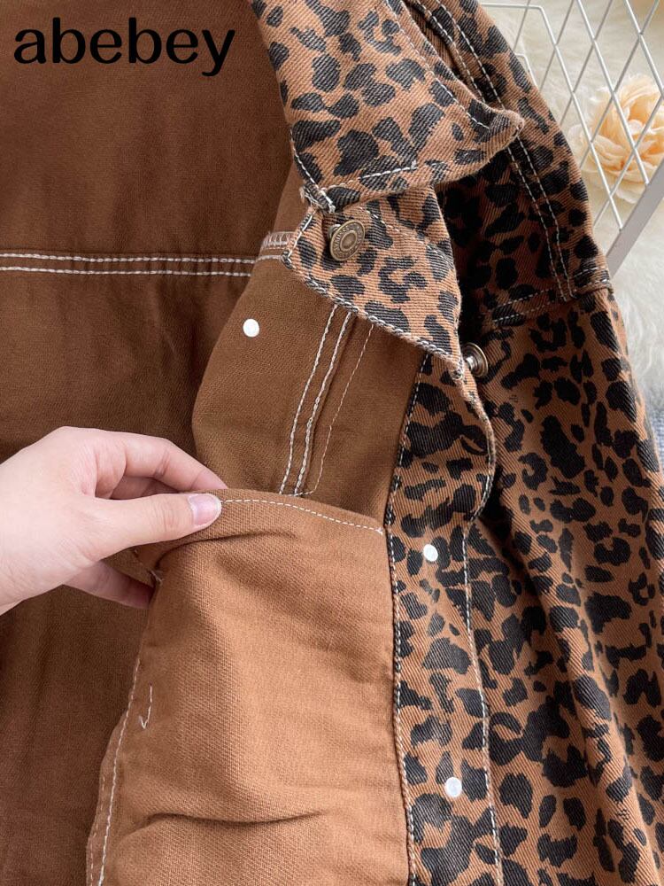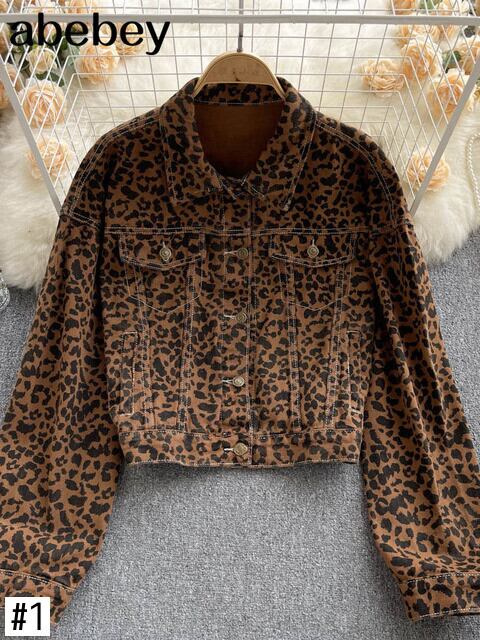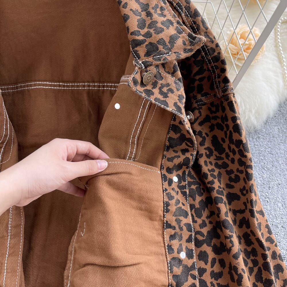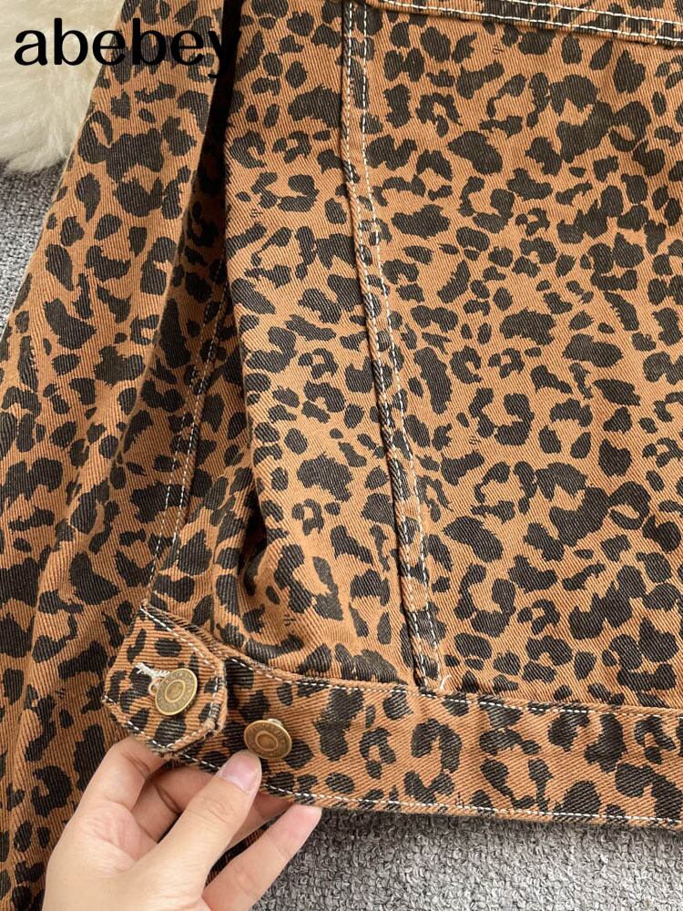 ヒョウ柄ショートデニムジャケットポケットルーズ長袖女性シングルブレストストリート RetroThin デニムクロップドコート ロング レトロ Abe87709544313